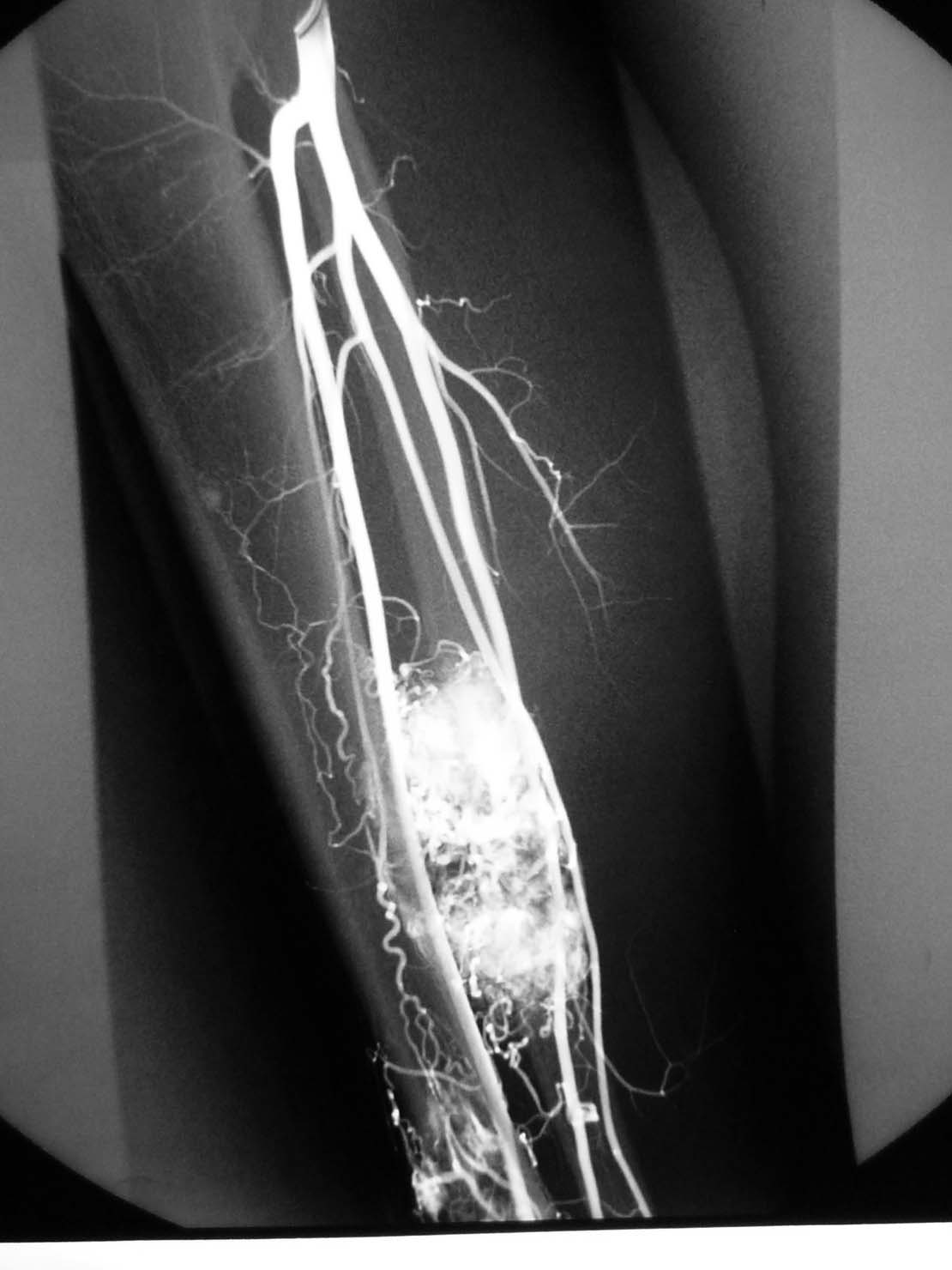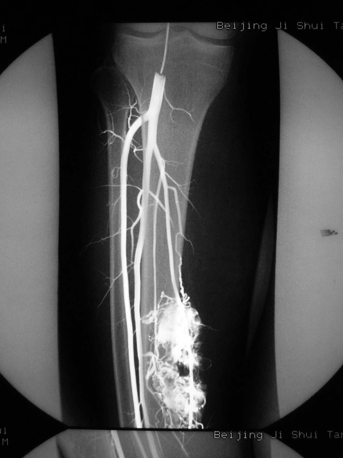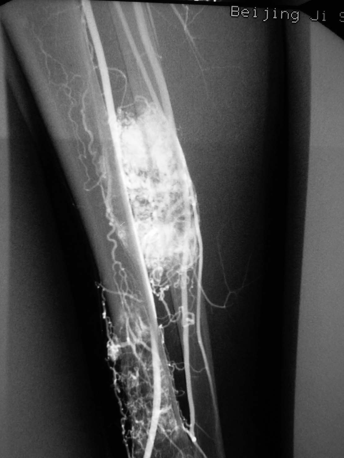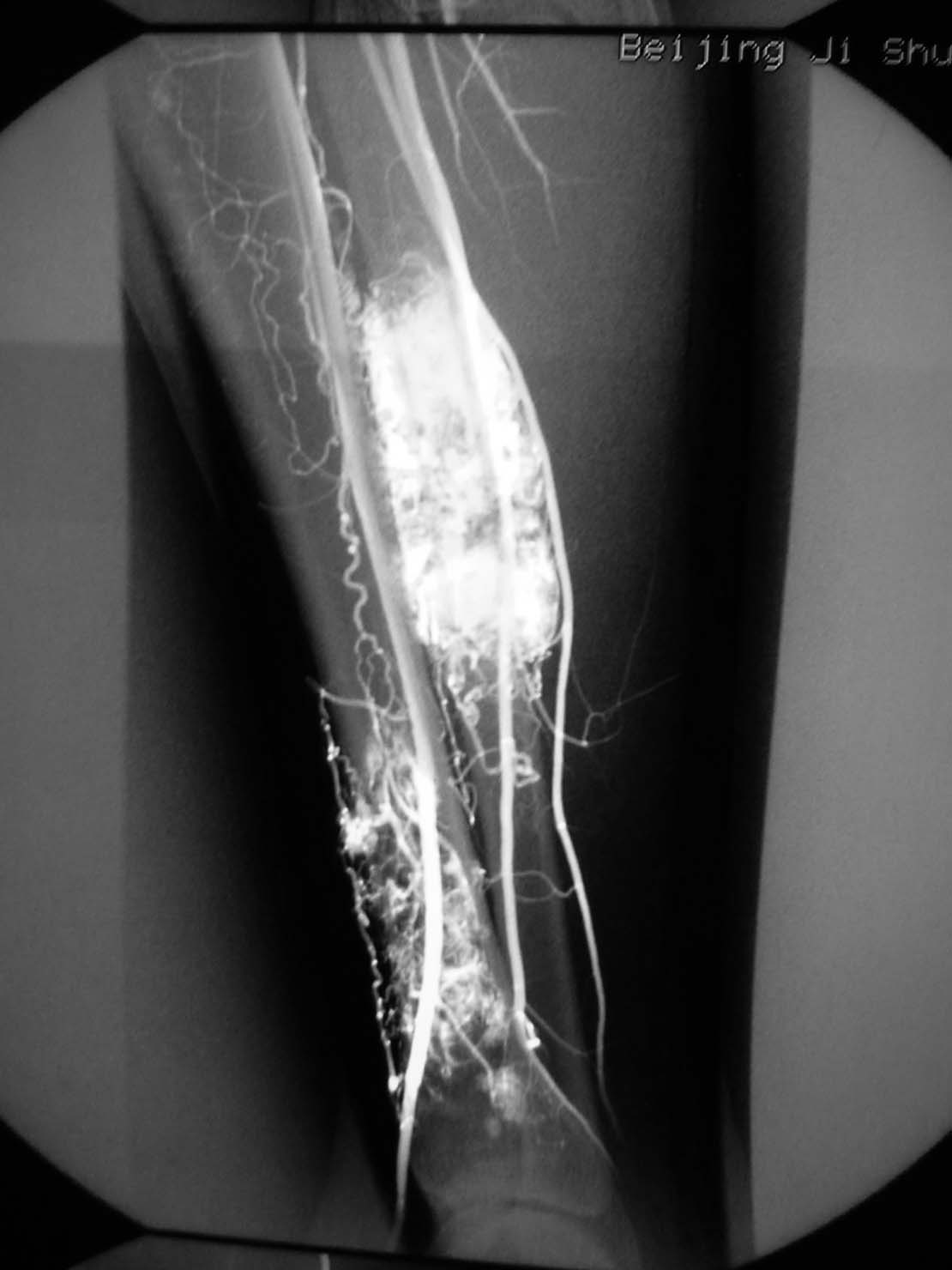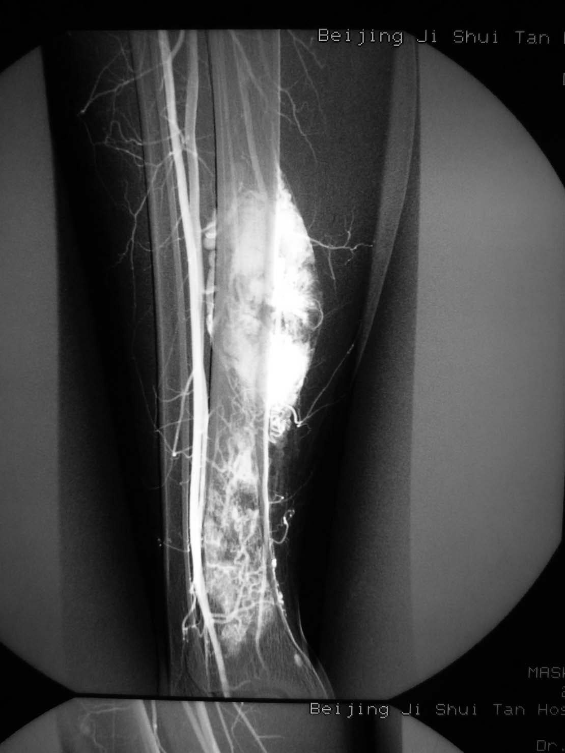 1、病史资料:男,26岁.右小腿肿物数年,近期疼痛加重。平片软组织未见明显肿物。