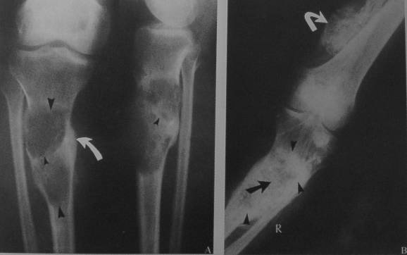 溶骨型骨肉瘤 下肢长骨为好发部位,初发部位为干骺端髓质。