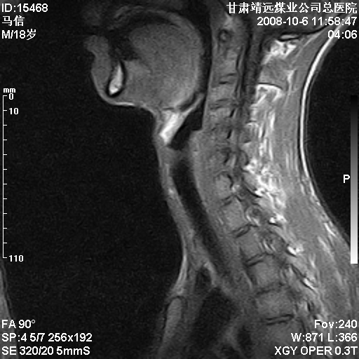 患者18岁,学生,在玩耍中受伤来检查,患者喜欢打篮球。颈椎内异常信号影,我们考虑占位,但是不像占位,又考虑硬膜囊的增厚,大家关建看颈椎椎管内的那个异常占位信号