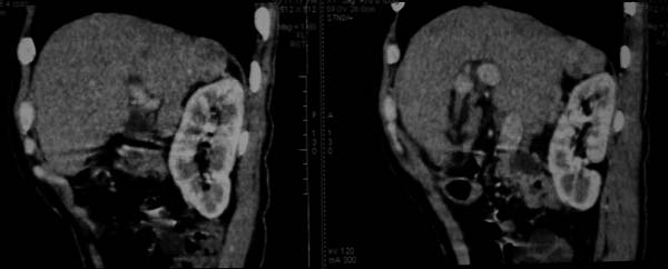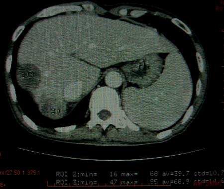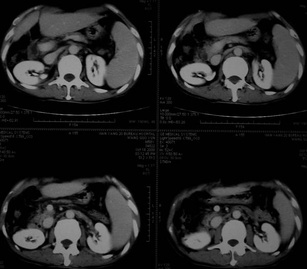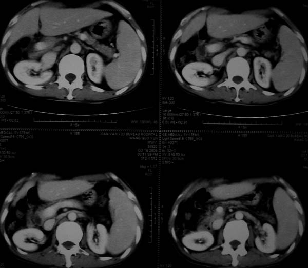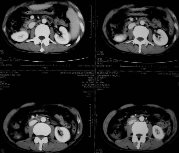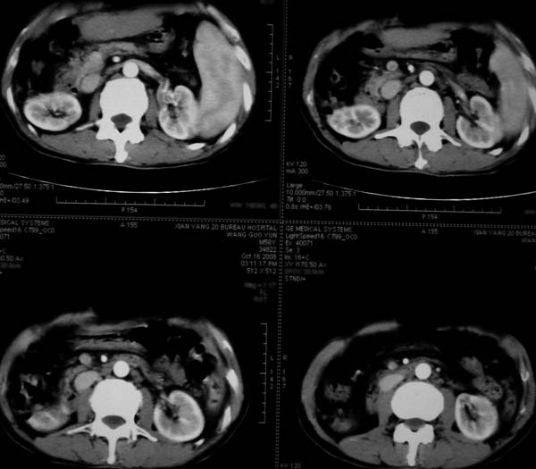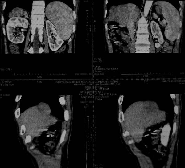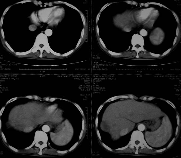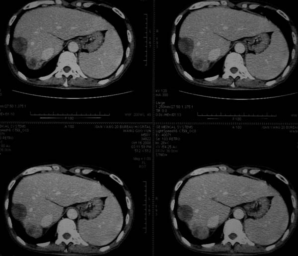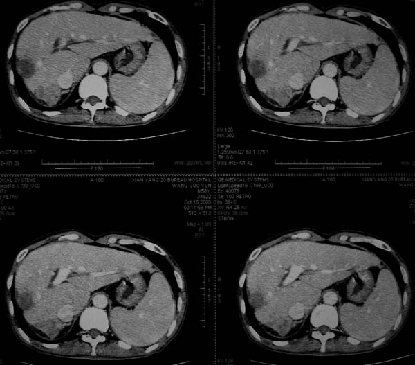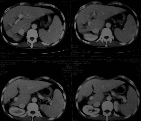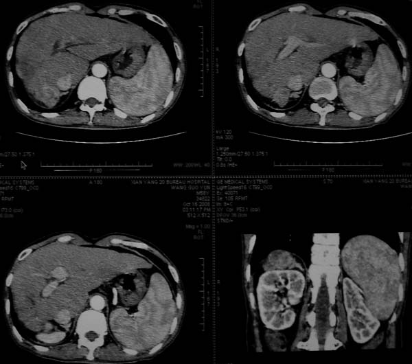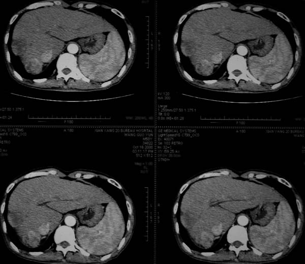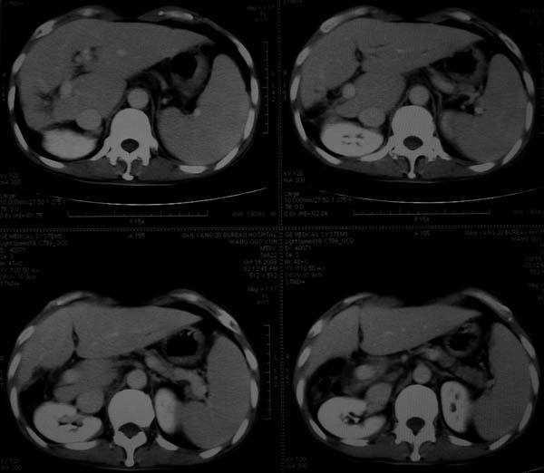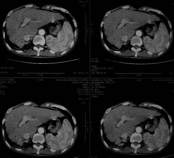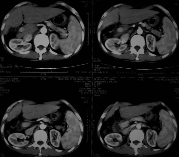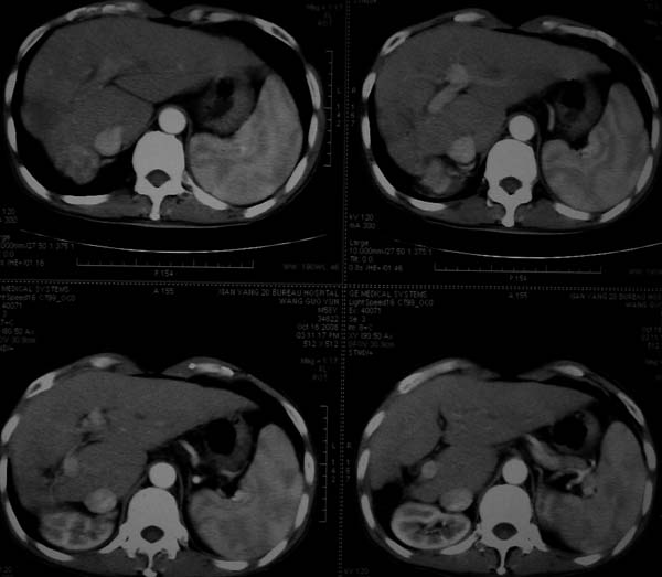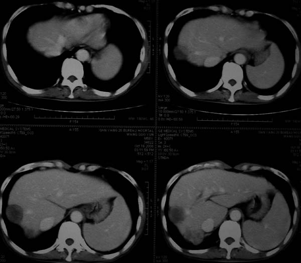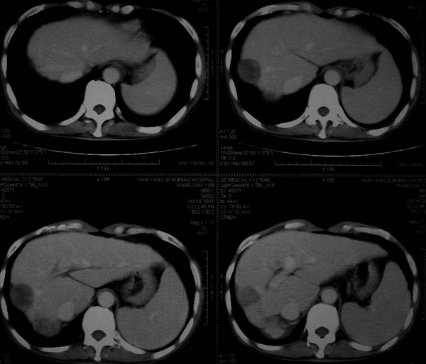 以下是引用sdzyy在2008-10-23 14:24:00的发言:[br]符合肝ca增强,\"快进快出\";肝叶比例失常,右叶萎缩,肝裂增宽,脾大,肝硬化可能.