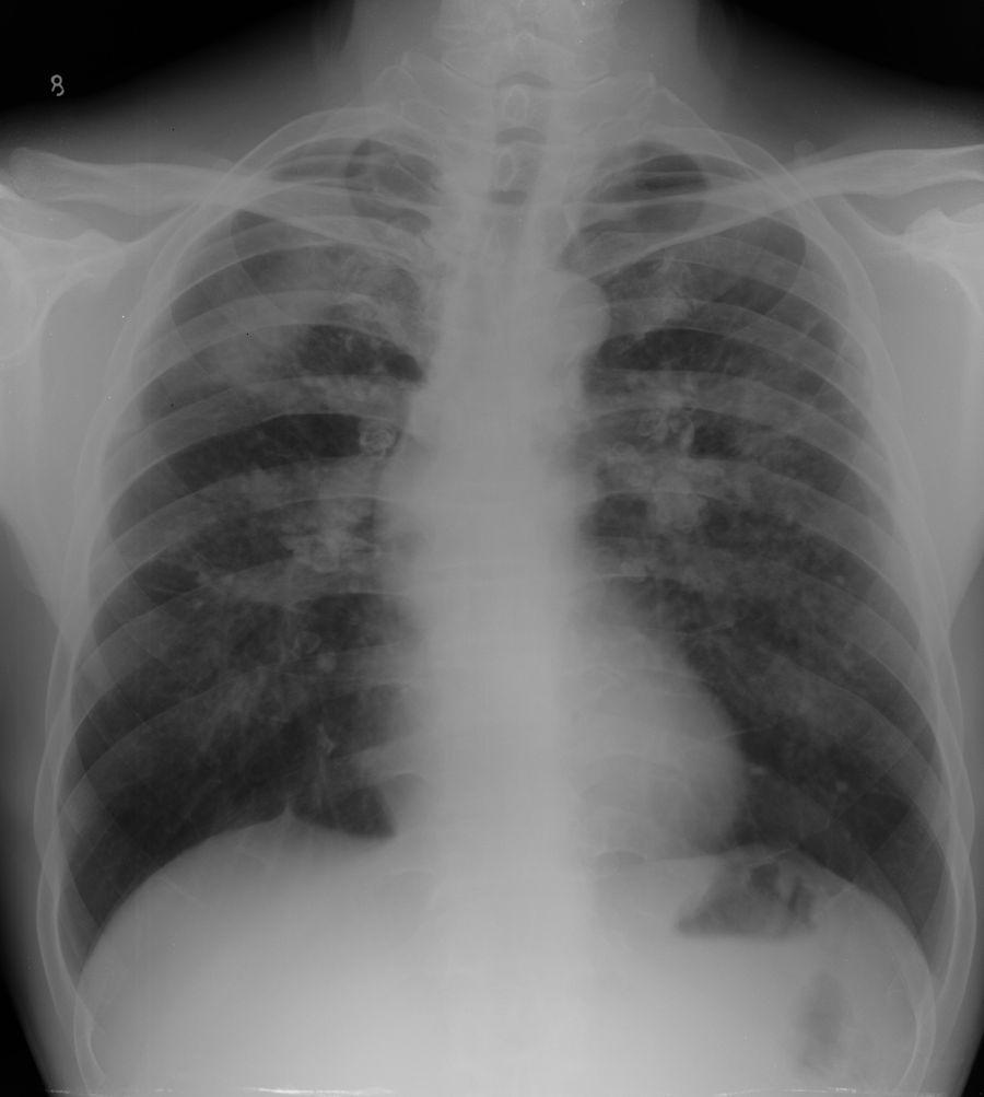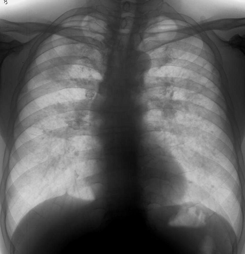 为一种不明原因的少见病,往往有家族史。无粉尘接触史。x线胸片示两肺满布细砂粒状结节阴影,大小1mm左右,边缘清楚,以肺内侧多见,肺门影不大,无肺纹理改变。病程进展缓慢,可达数十年。