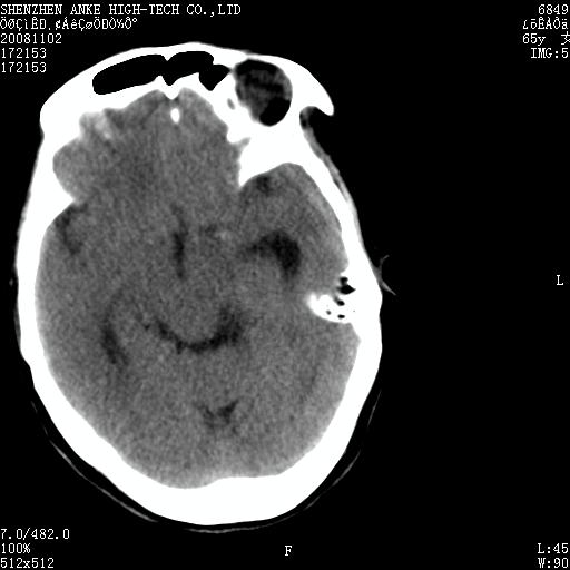 左侧脑外占位(脑膜瘤)压迫脑实质、脑室侧室孔所致。支持!