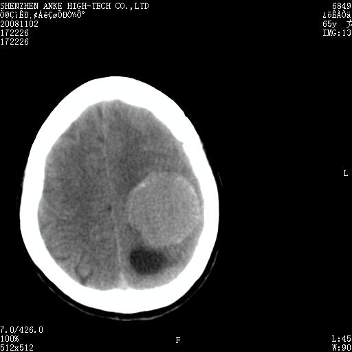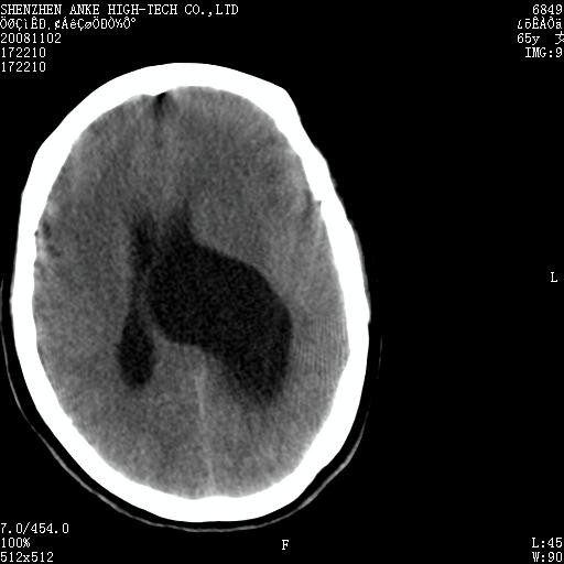 左侧脑外占位(脑膜瘤)压迫脑实质、脑室侧室孔所致积水。支持!