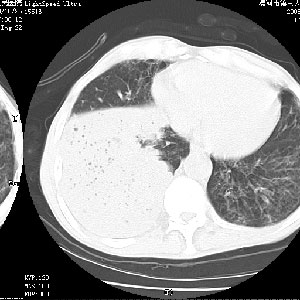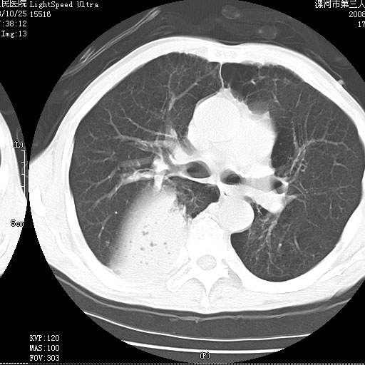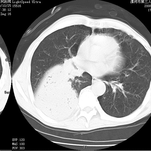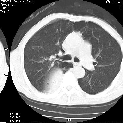3、细支气管肺泡癌可以排除,病变以斜裂为界,呈大片状高密度影,内可见多发小气泡,表明有产气杆菌感染所致,内无明显的支气管“枯树枝征”表现,再结合其临床改变(细支气管肺泡癌临表表现重、影像表现轻)所以不符合细支气管肺泡癌(炎症型)的改变。
