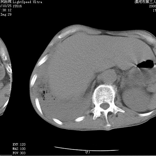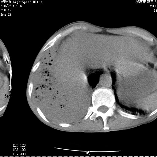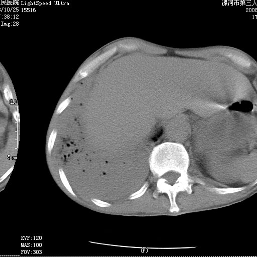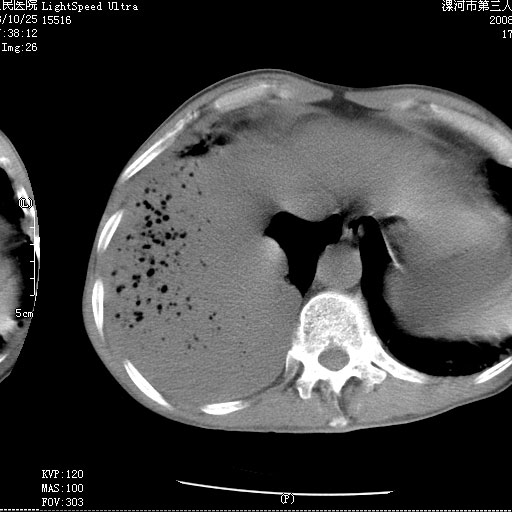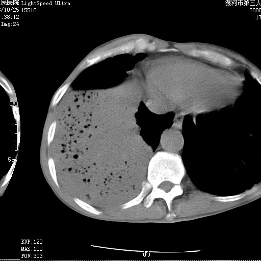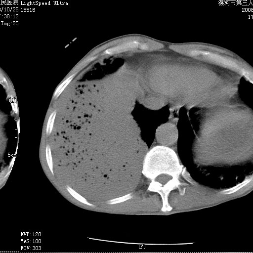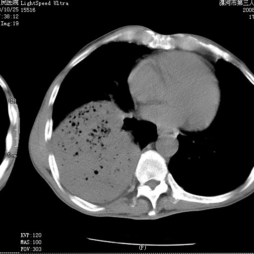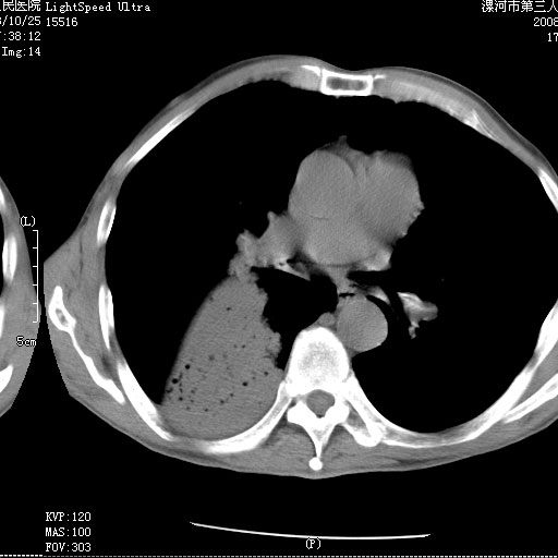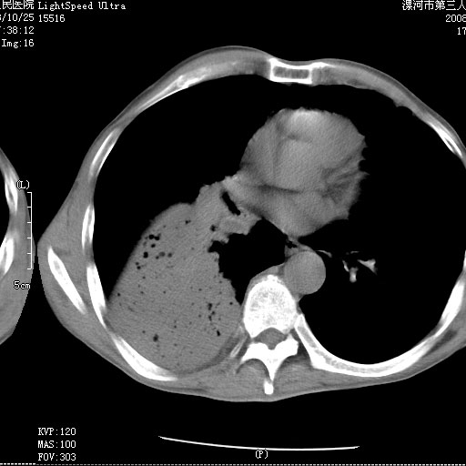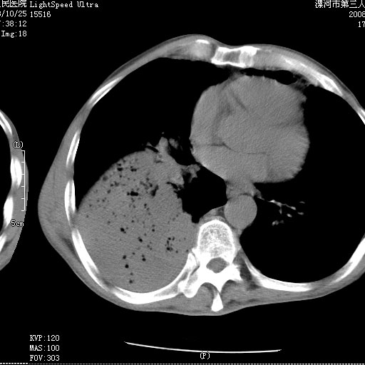右下肺实变,内有弥漫分面小气泡而无支气管征,叶间裂前移,呈臌大之形,而无收缩之状,兼纵隔稍左行移,故。不支持不张,倒支持大叶肺叶,如楼上所说,小气泡不象残留之肺,不可以考虑产气菌感染吗。