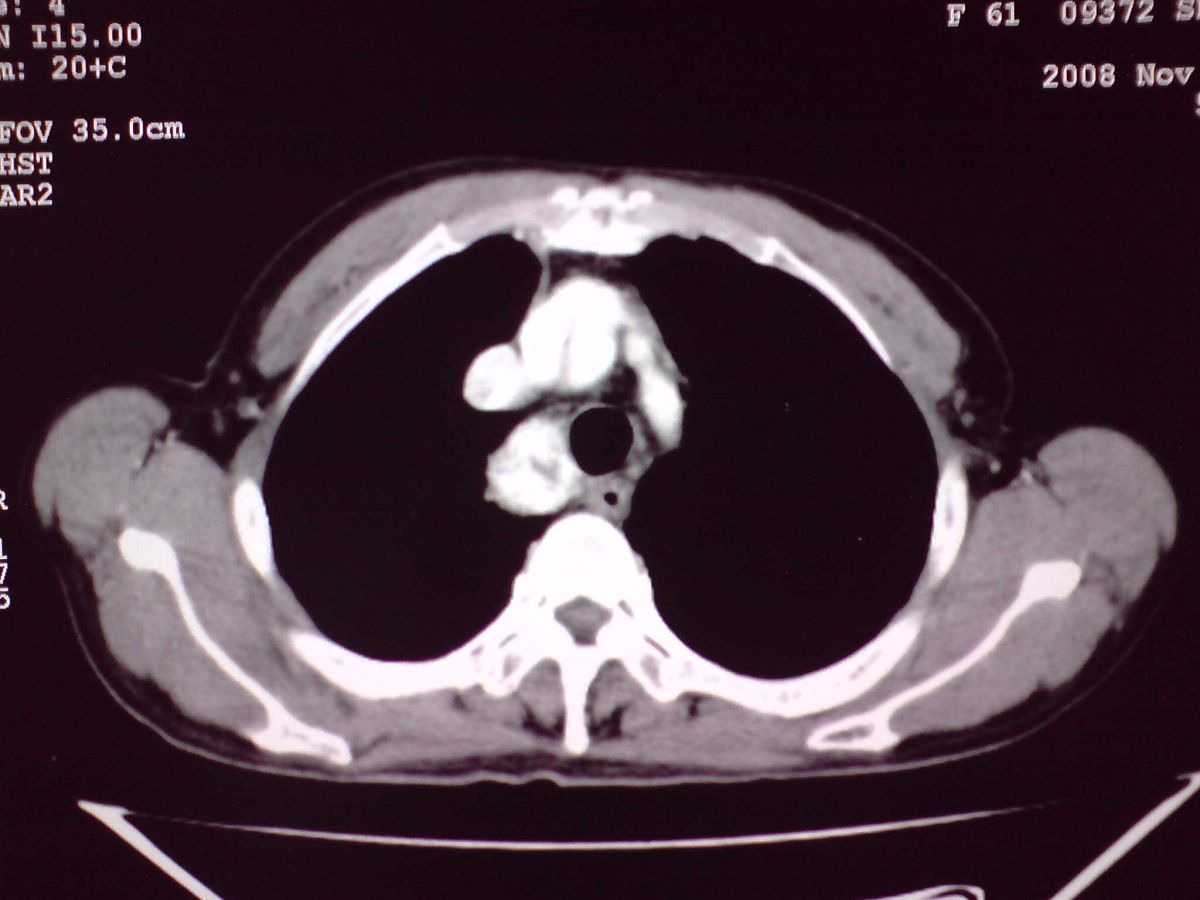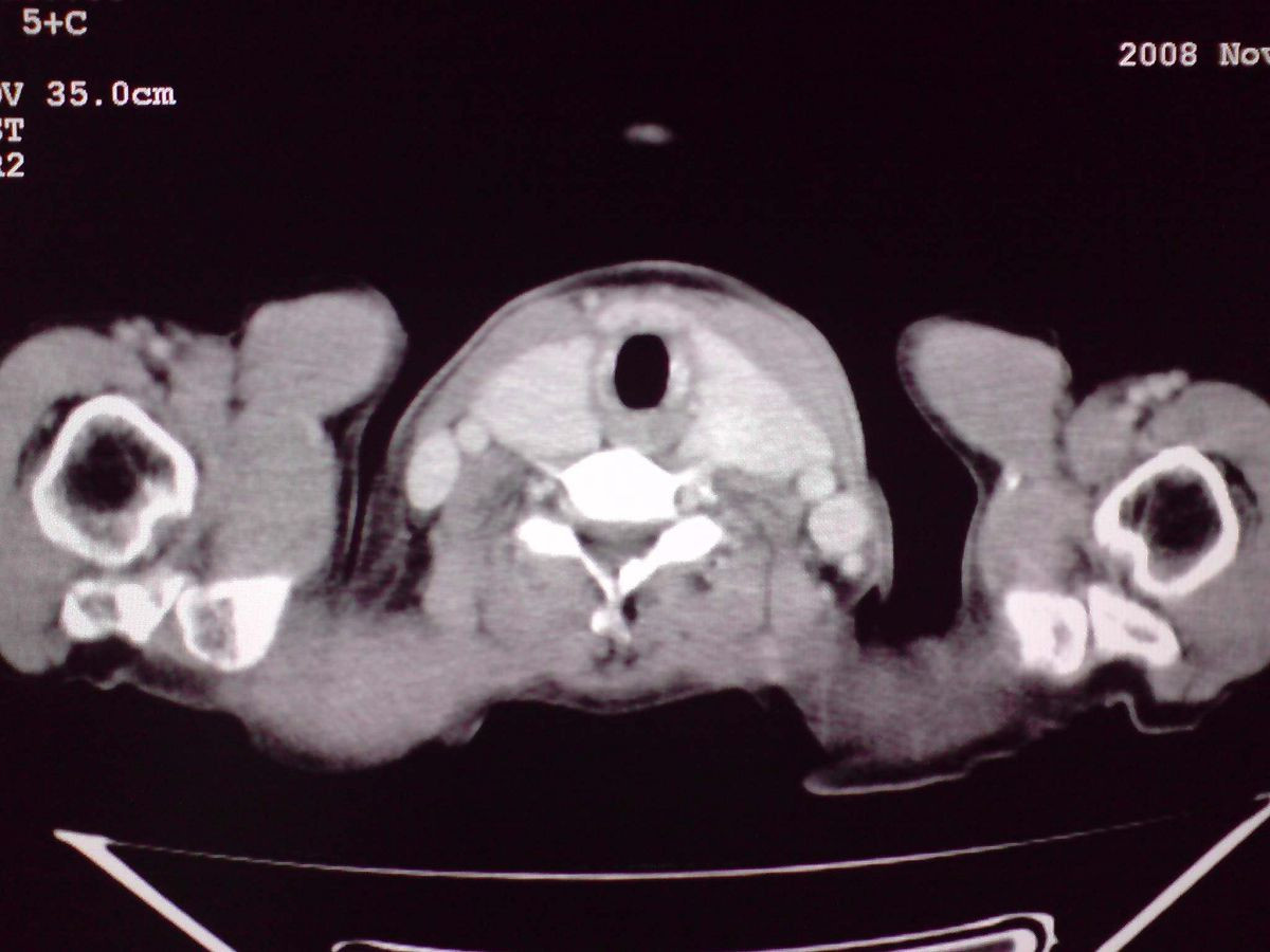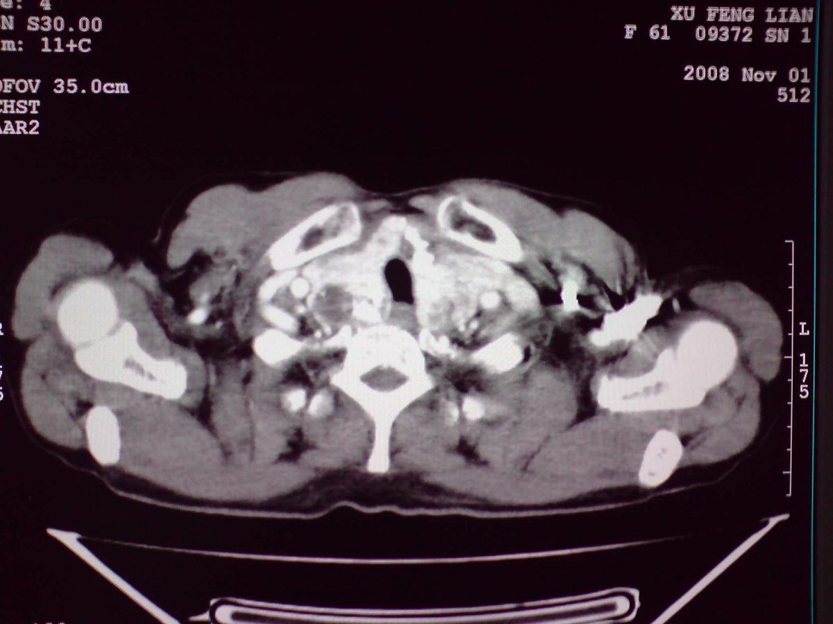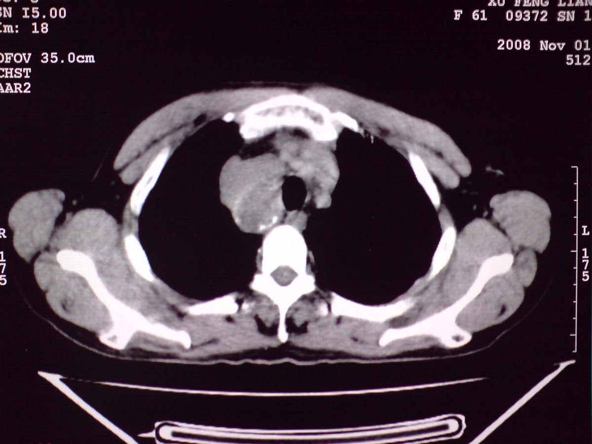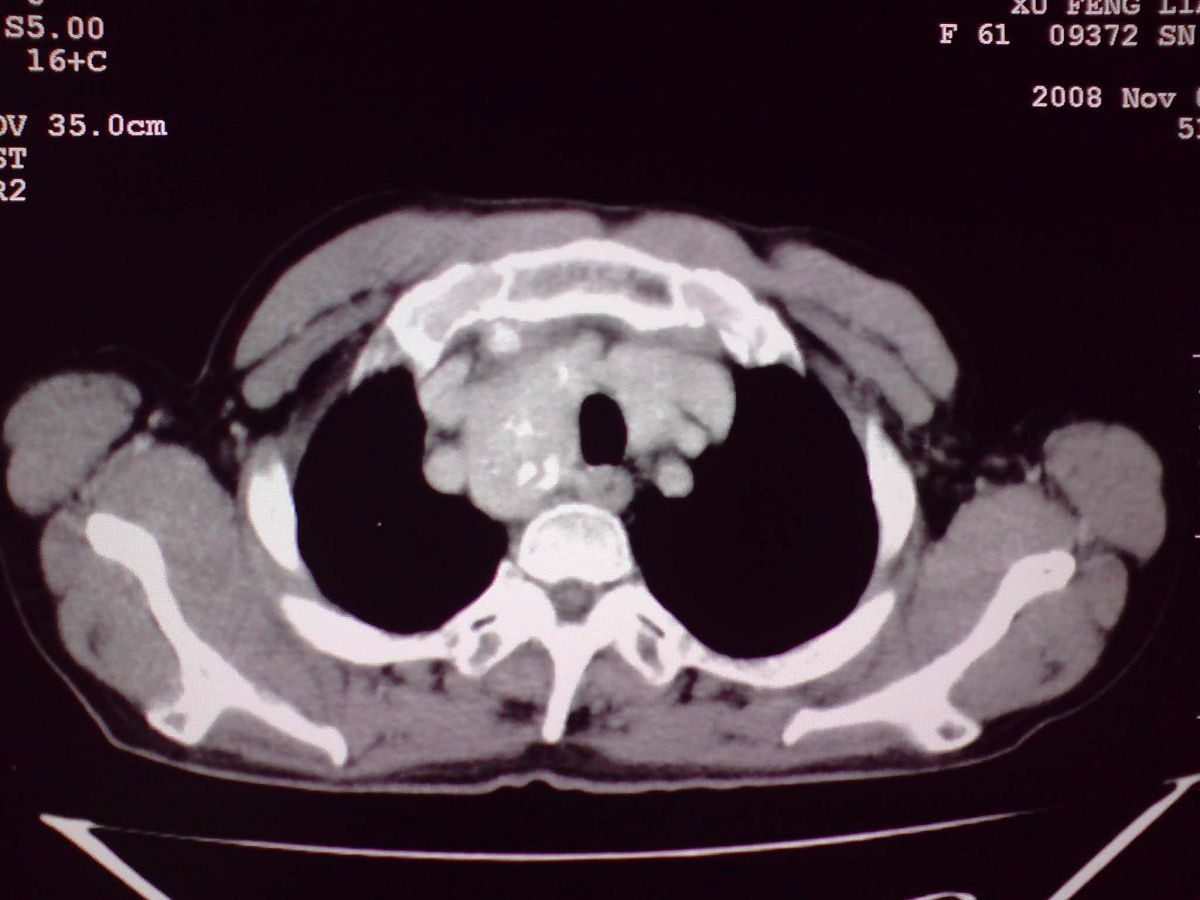 以下是引用zsl6918在2008-11-6 22:38:00的发言:[br]结节状甲状腺肿,部分突入胸腔,形成胸内甲状腺