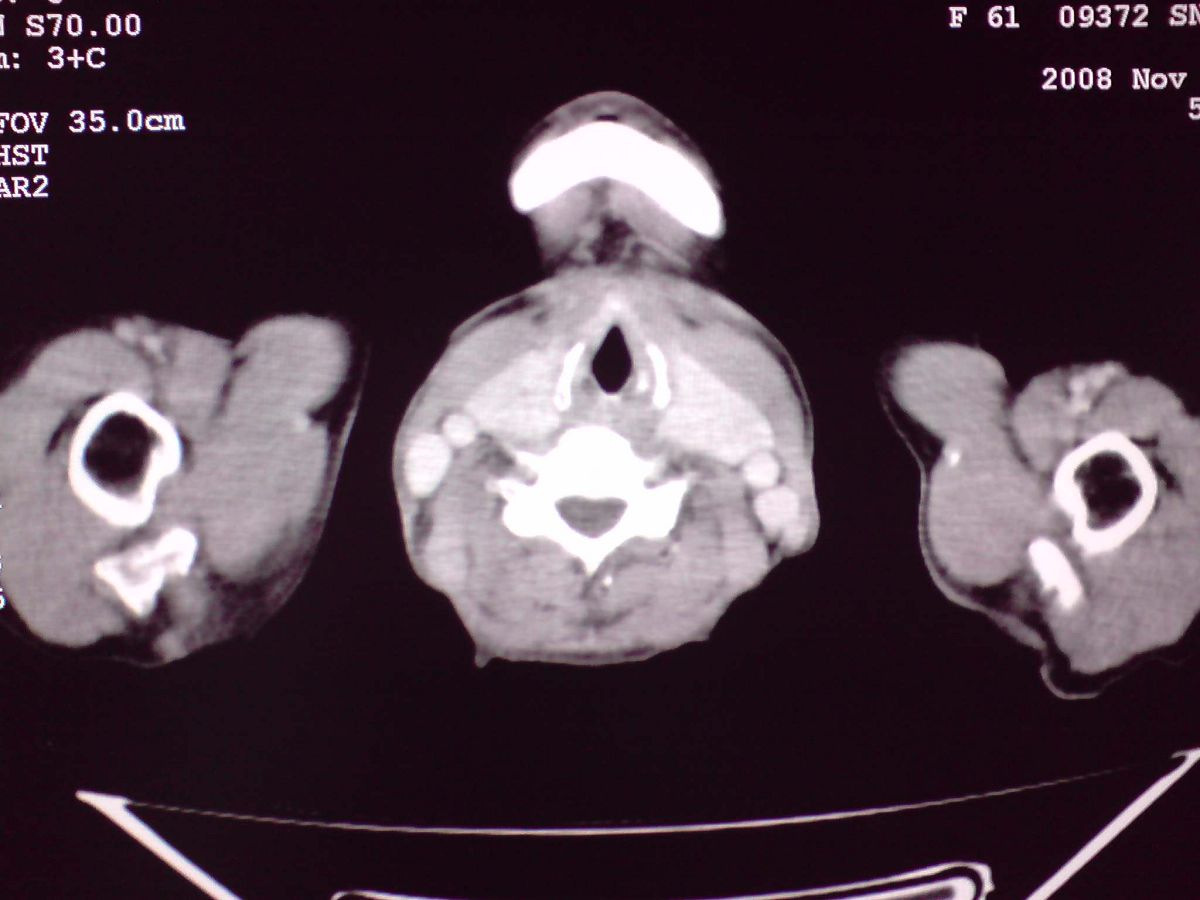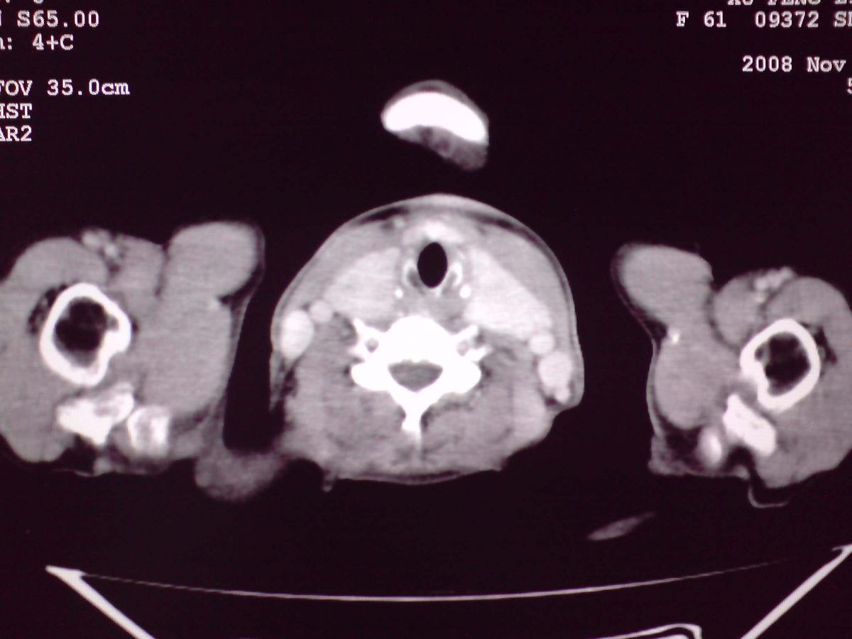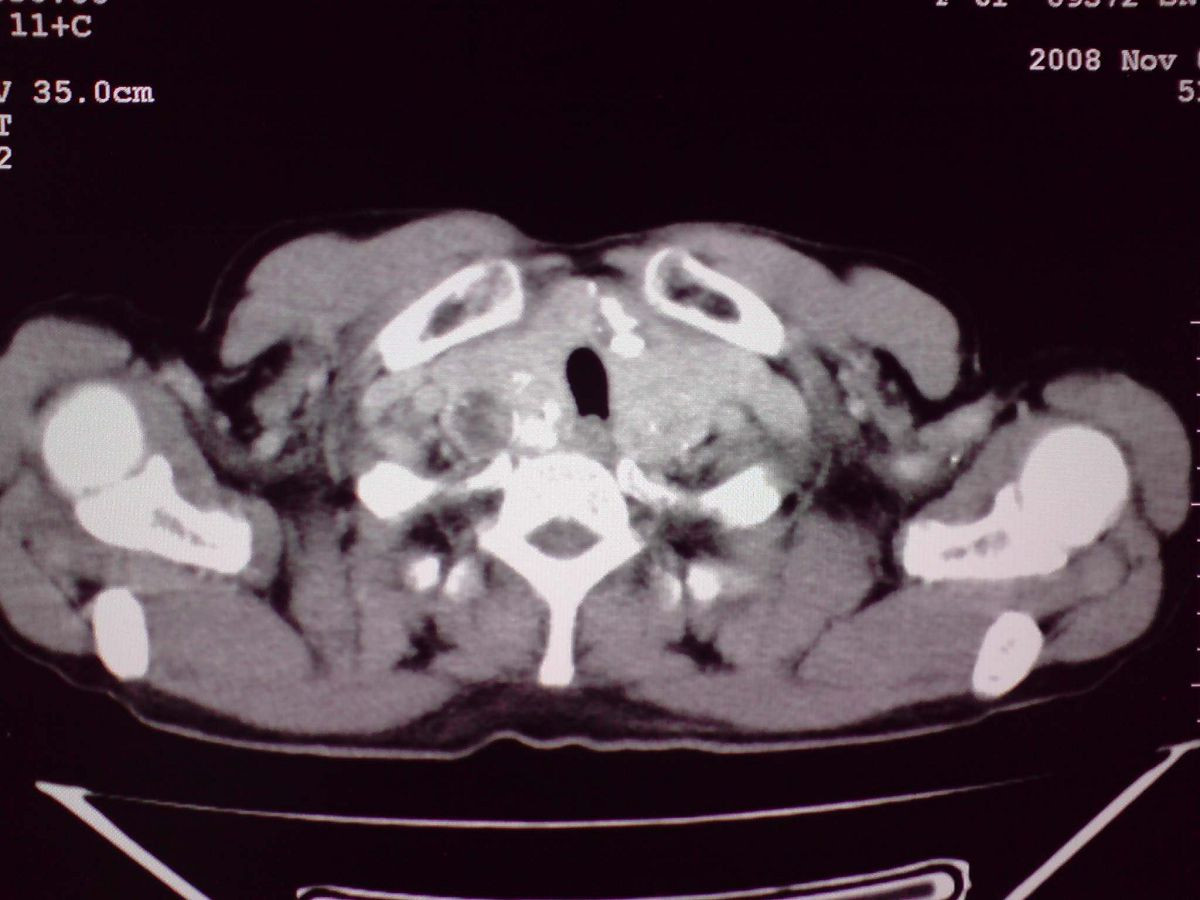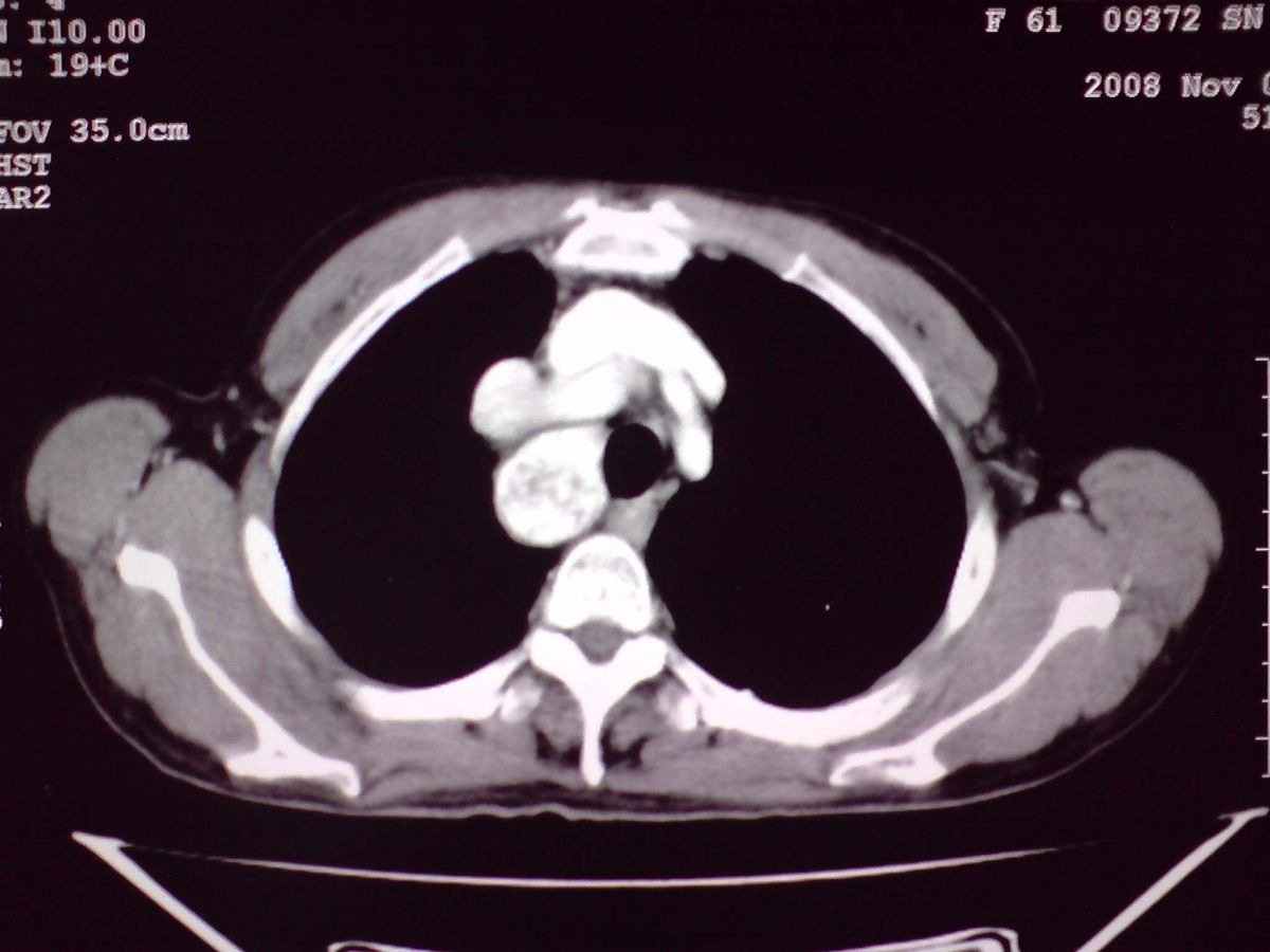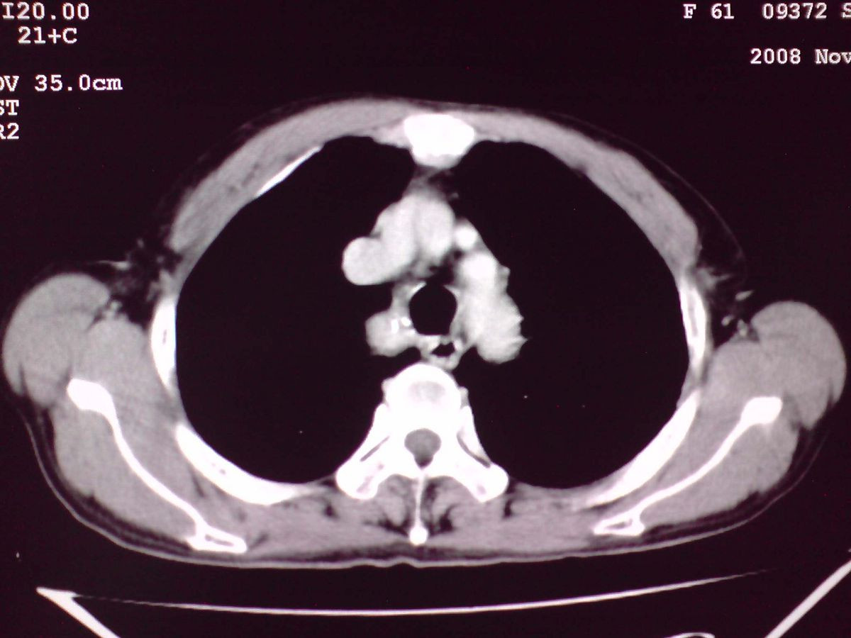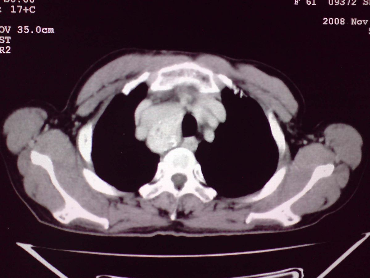 以下是引用zsl6918在2008-11-6 22:38:00的发言:[br]结节状甲状腺肿,部分突入胸腔,形成胸内甲状腺