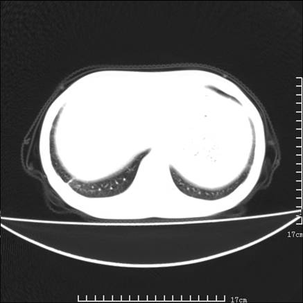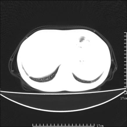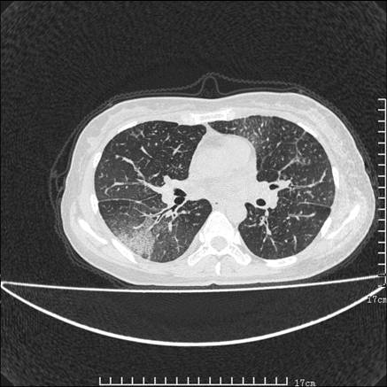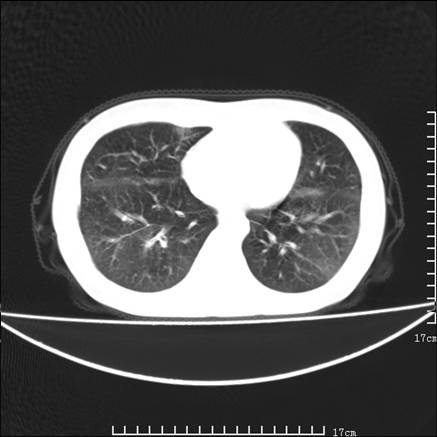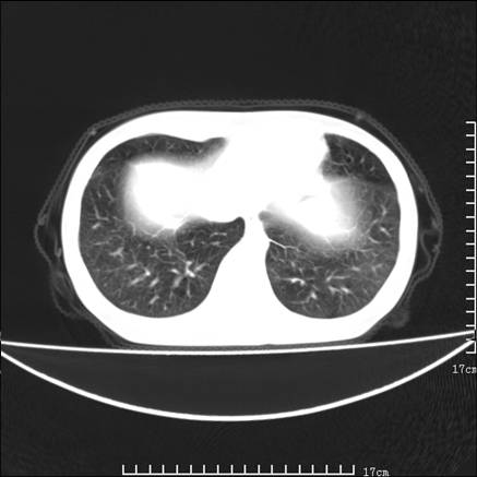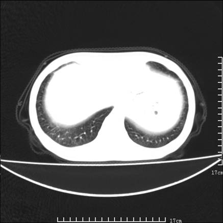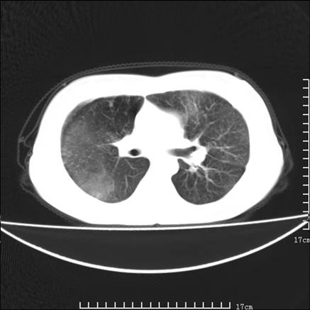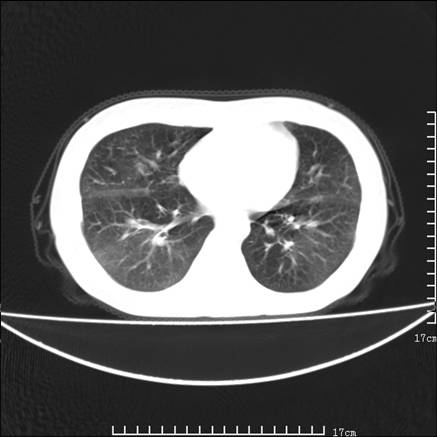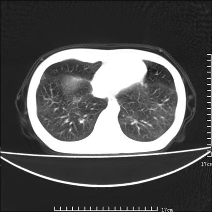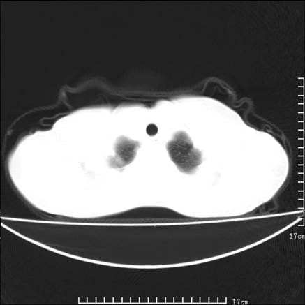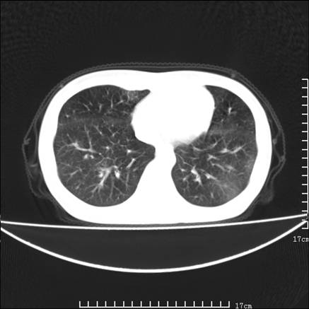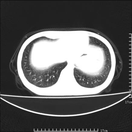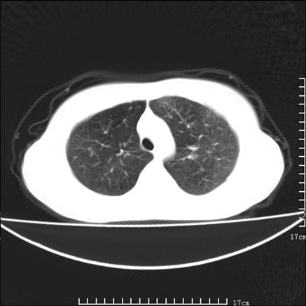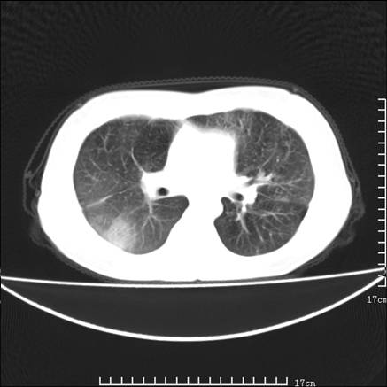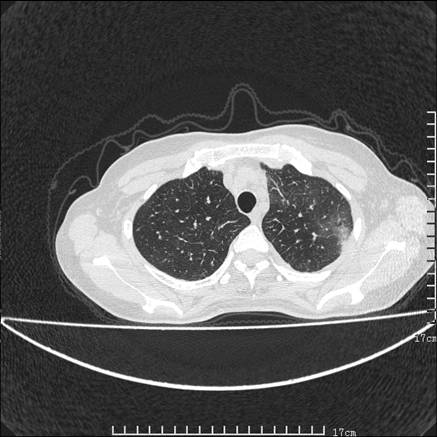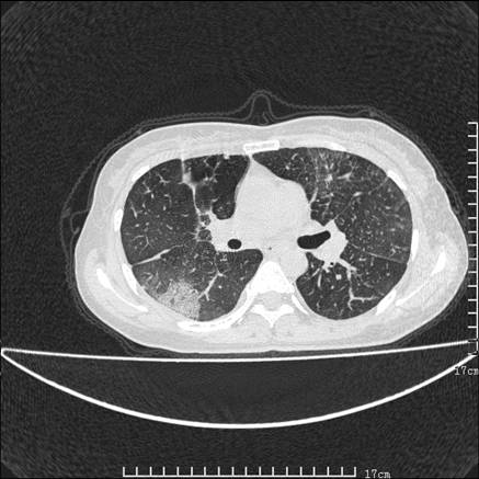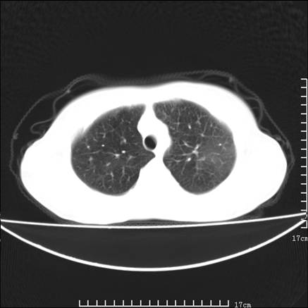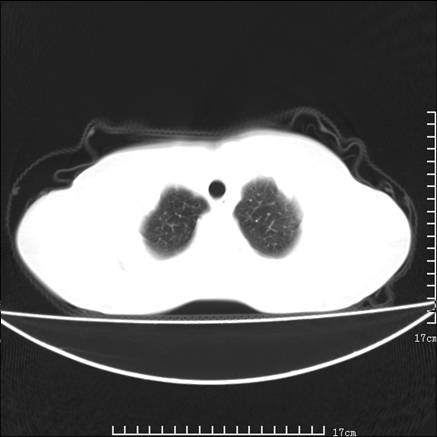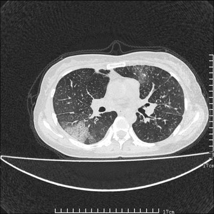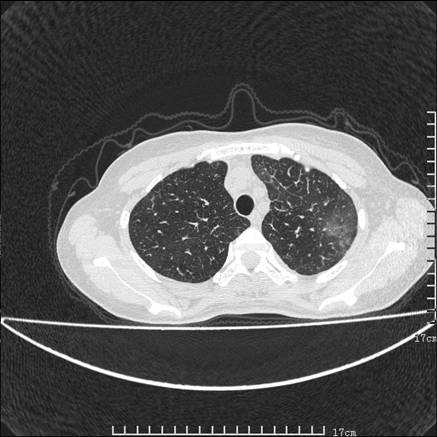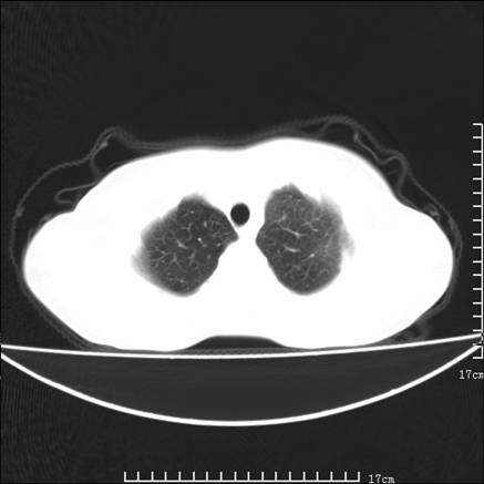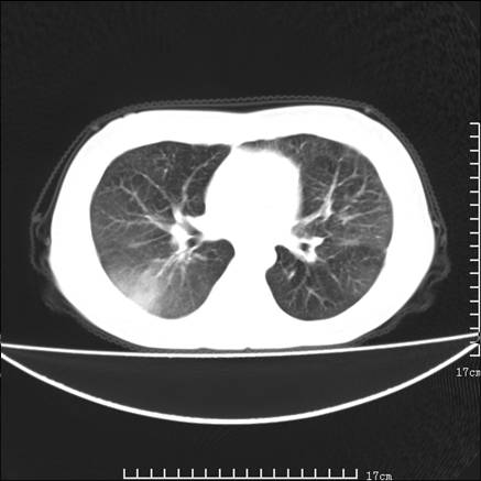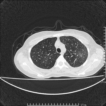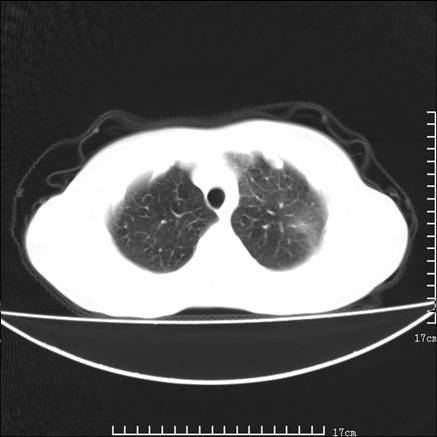 女,46岁,患胃溃疡多年,溃疡大小约1.0cm左右,后于5年前手术,病理为胃癌。主诉:半月前感冒后胸闷,气短,有咳嗽,无明显咳痰,无发热。偶有腰背部不适。