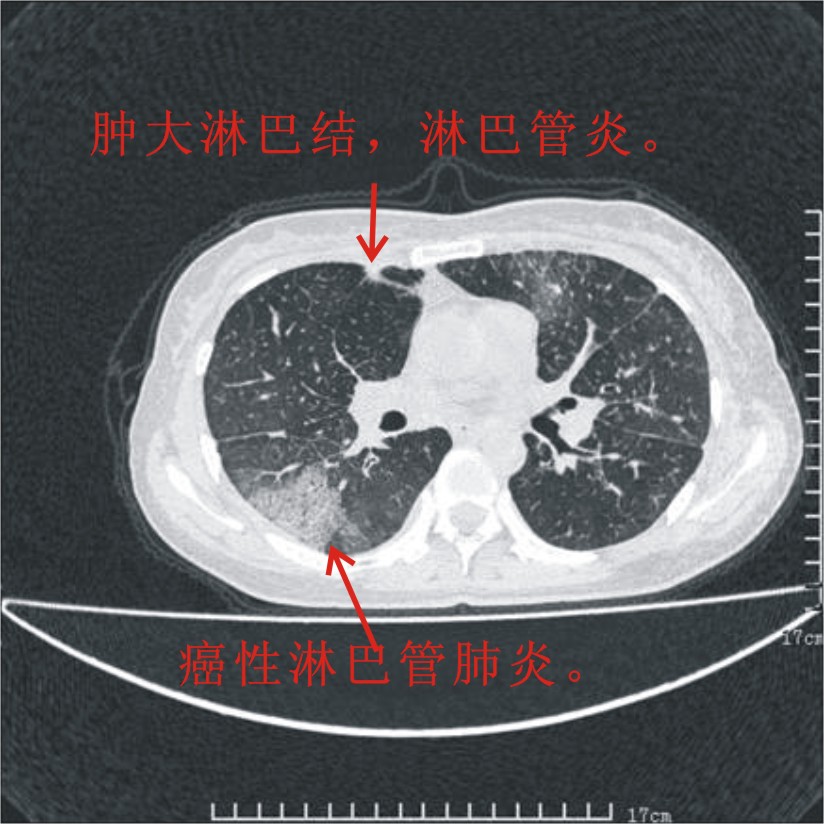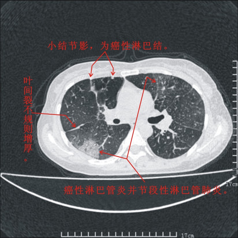 结合病史:认为是典型肺部癌性淋巴管炎、淋巴结转移。请看图解。