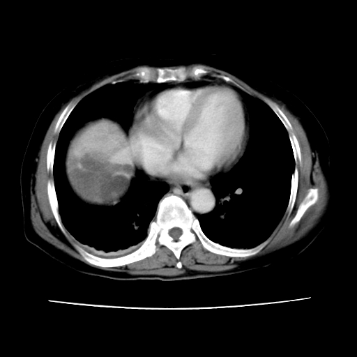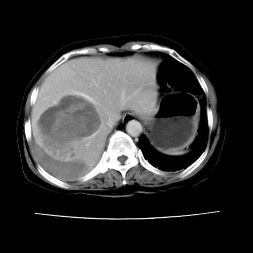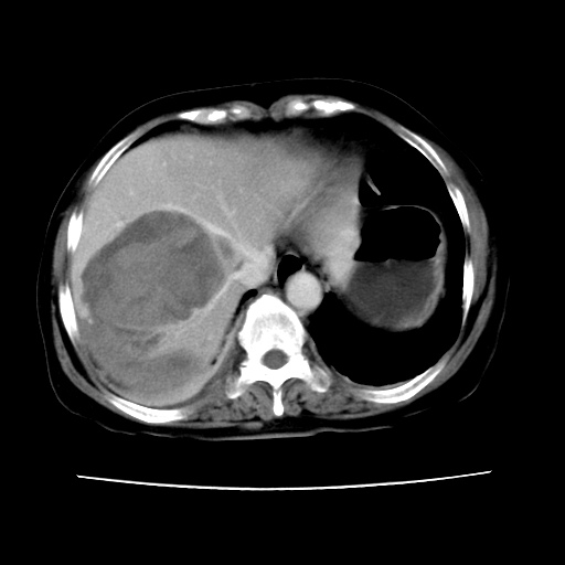 6月份ct片显示肝内巨大混杂密度团块,伴包膜下积液(内含液液平面),增强多无明显强化。只能考虑肝占位病变,并肝内、包膜下血肿。肝ca并出血多见,而肝血管瘤并破裂出血少见。