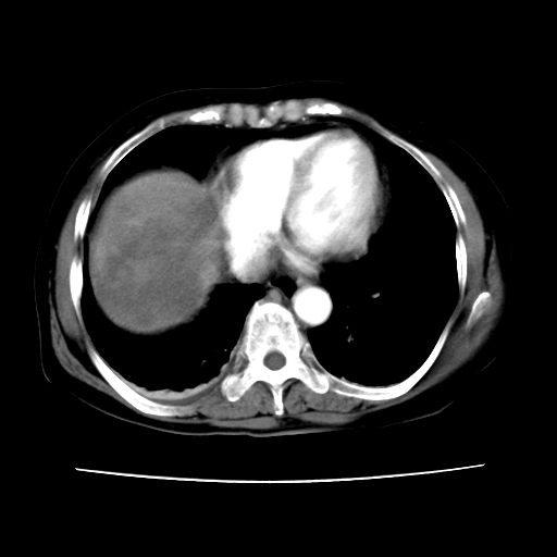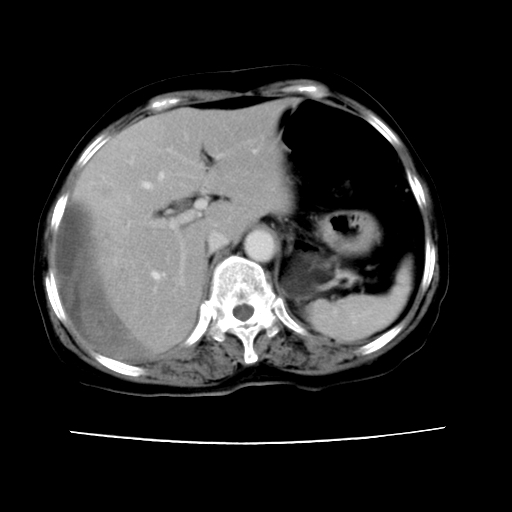 考虑为肝血管瘤破裂出血并肝包膜下血肿;右侧少量胸腔积液。