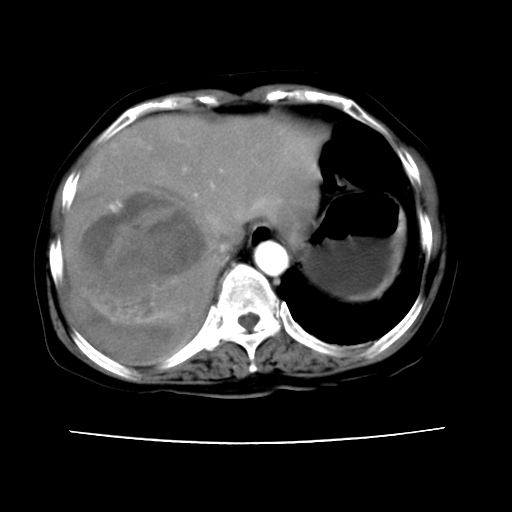 6月份ct片显示肝内巨大混杂密度团块,伴包膜下积液(内含液液平面),增强多无明显强化。只能考虑肝占位病变,并肝内、血膜下血肿。肝ca并出血多见,而肝血管瘤并破裂出血少见。
