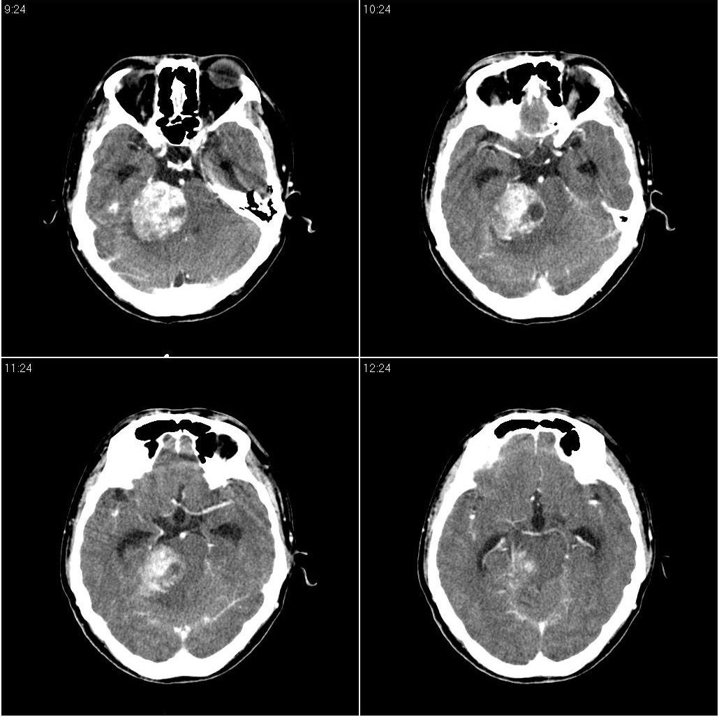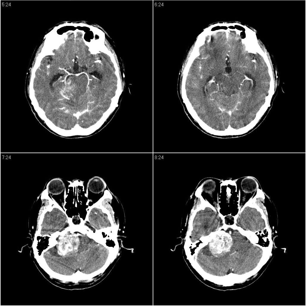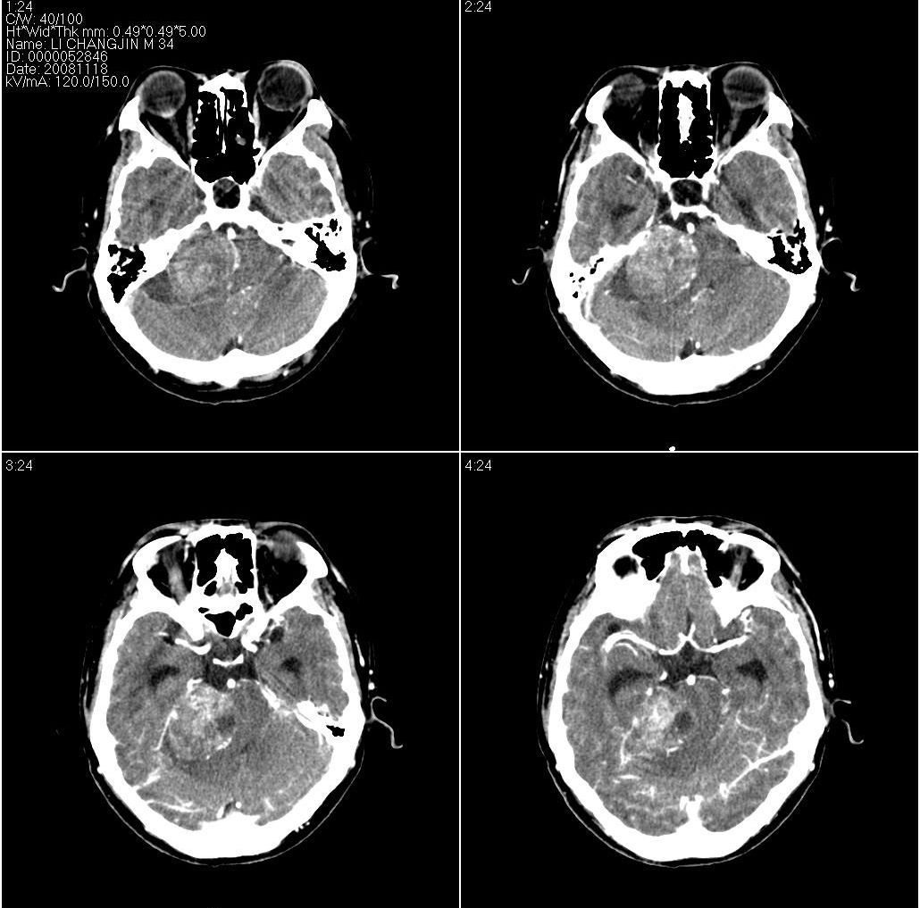 脑干密度减低,增大,与周围界限不清,四脑室受压显示不清;右侧桥小脑角区似可见稍高密度影;建议行mri检查。