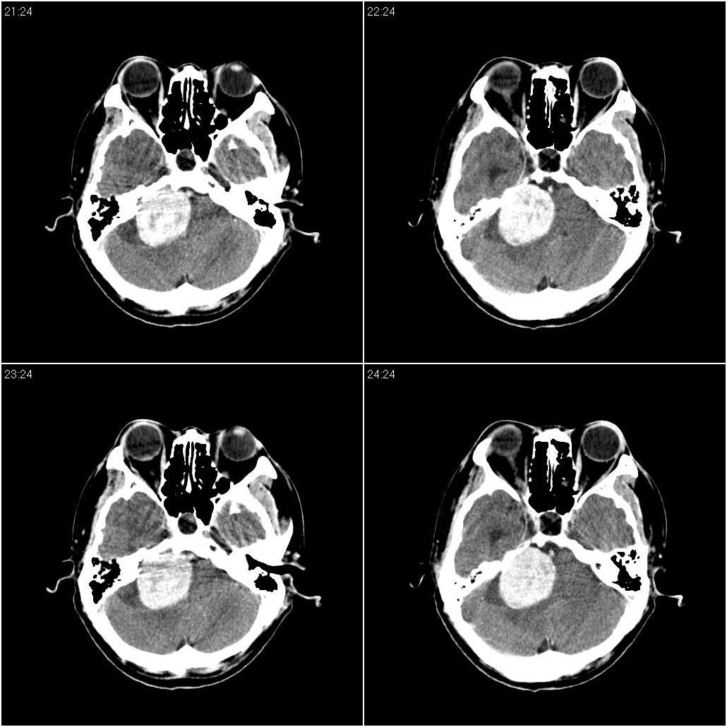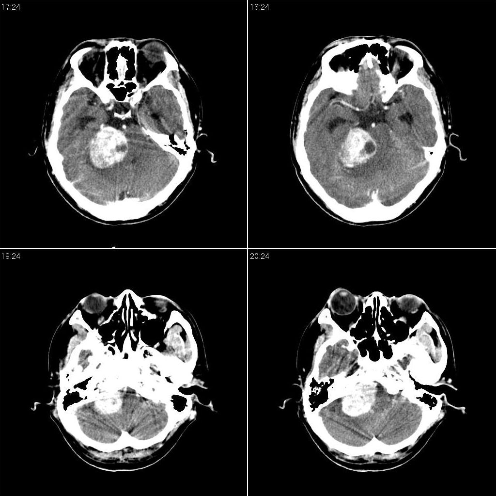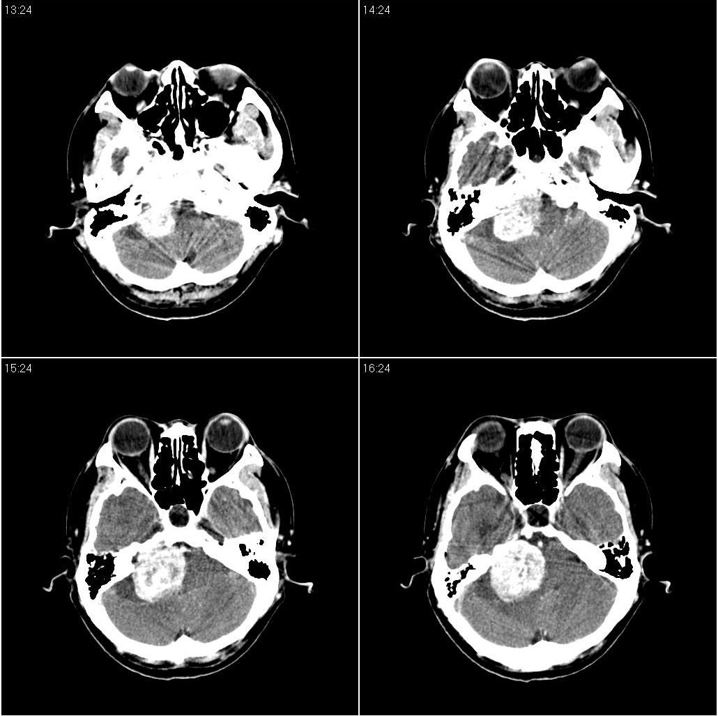 以下是引用zjzjr在2008-11-18 9:26:00的发言:[br]支持右侧小脑半球占位性病变伴梗阻性脑积水。建议增强,上传骨窗,除外听神经瘤
