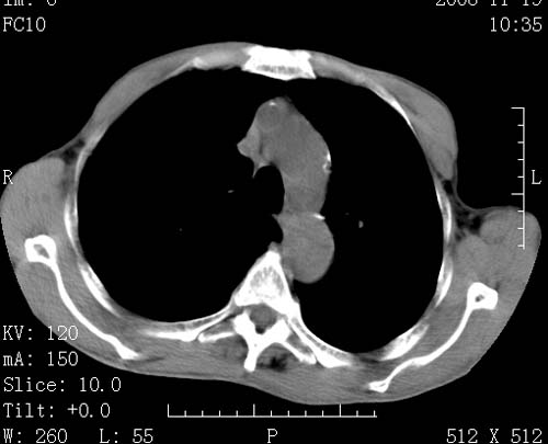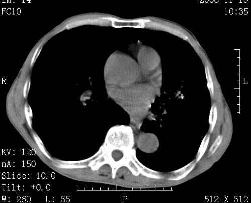 以下是引用随光逐影在2008-11-19 14:53:00的发言:[br]1)符合食管癌表现。2)两肺及纵隔淋巴结多发性转移瘤。3)左肺上叶舌段及两肺下叶炎症感染。