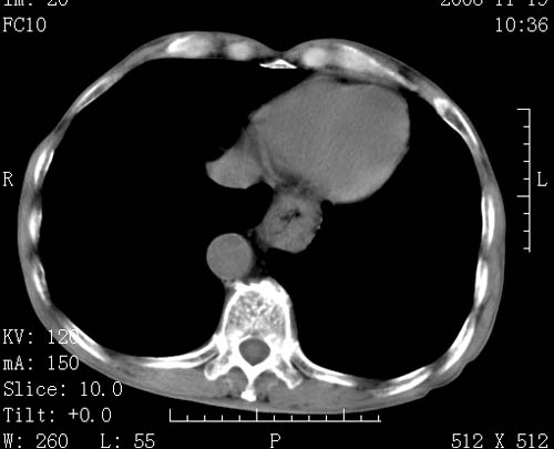 首先考虑转移,纵隔内淋巴结亦肿大;