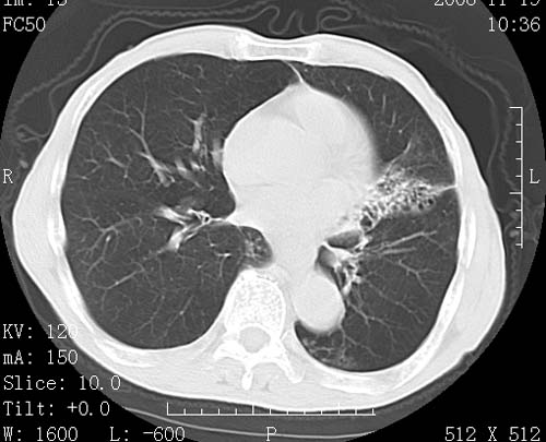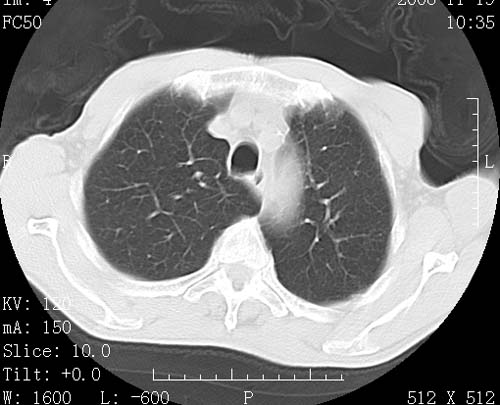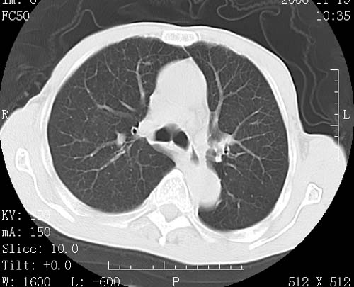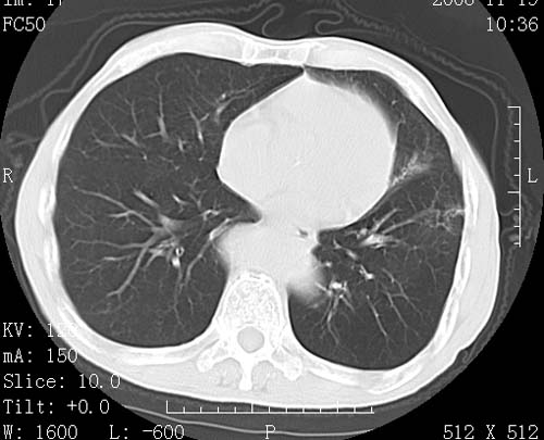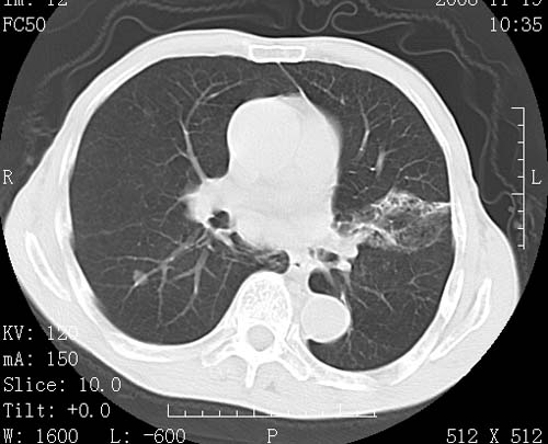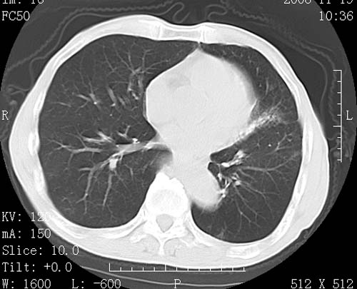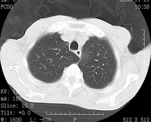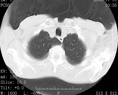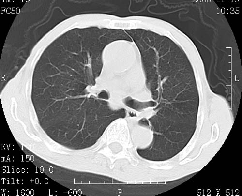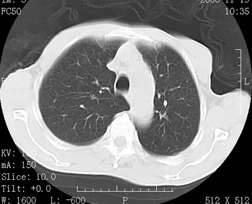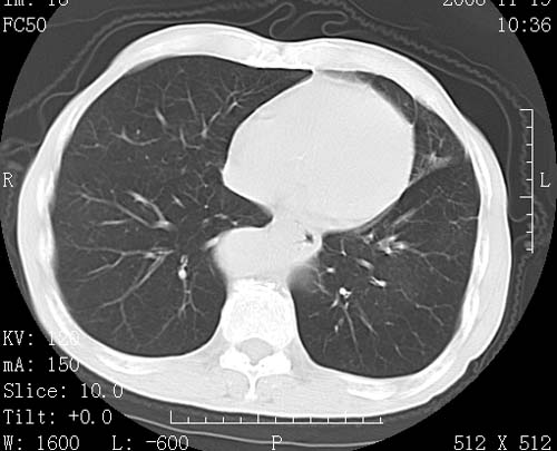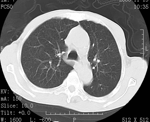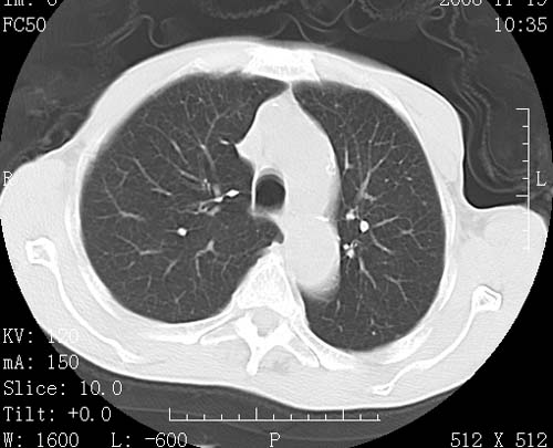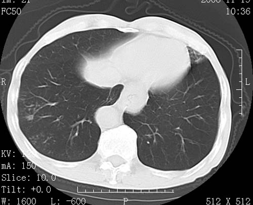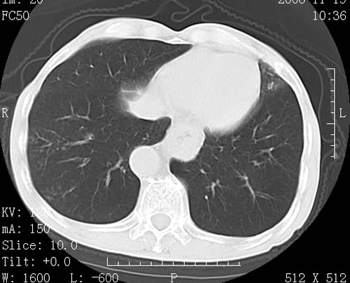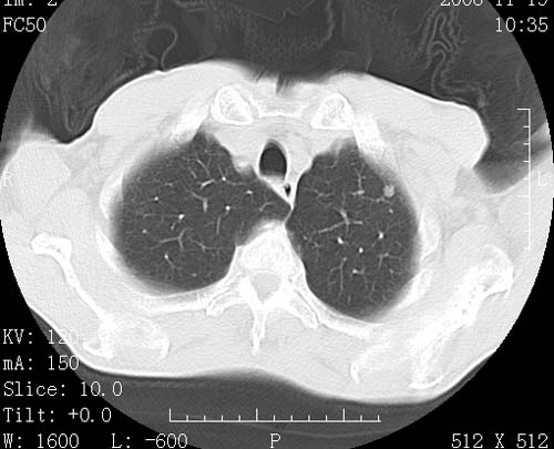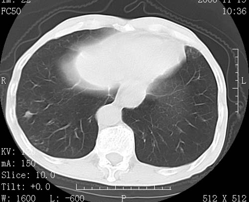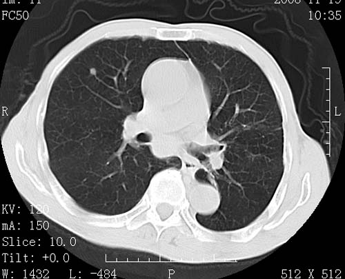 食管癌伴双肺转移,评述:肺部毛细血管网丰富,全身血液均快速流经肺部,癌细胞容易过滤定植,形成转移瘤,影象特点为以毛细血管末梢为中心的结节灶,边缘光滑锐利,少见有中心空洞着,不同来源的转移瘤可有各自特点,如甲状腺癌为双肺弥漫性微结节,本例有原发灶,双肺影象灶典型,左肺舌段条带状网格样伴胸膜天幕征,可视为癌性淋巴管炎。