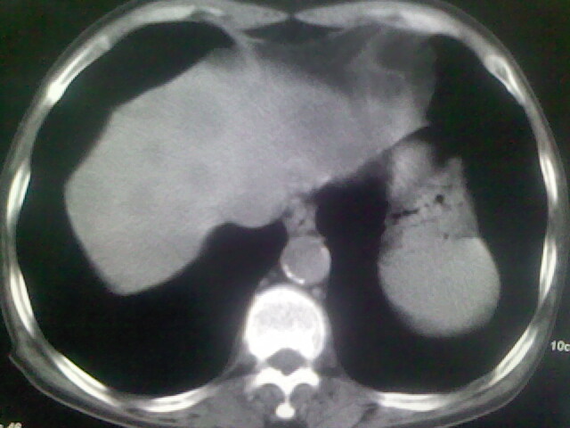 右上肺周围型肺癌,肝内多发低密度影---转移瘤?建议增强;胃壁明显增厚.