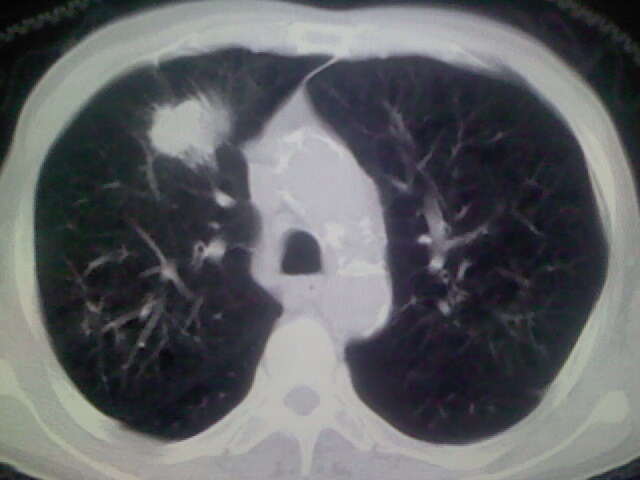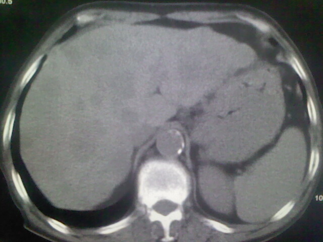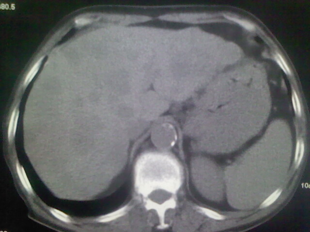 1、右肺上叶周围型肺癌并纵隔、颈部淋巴结转移,肝多发转移灶。