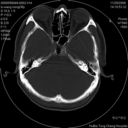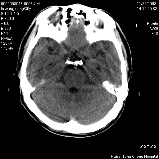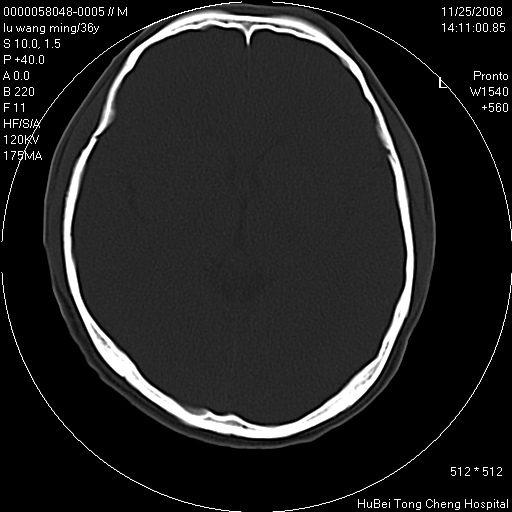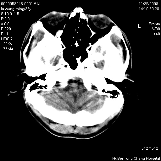 颅脑ct轴位平扫(层厚、层距均匀10mm),图像如下: