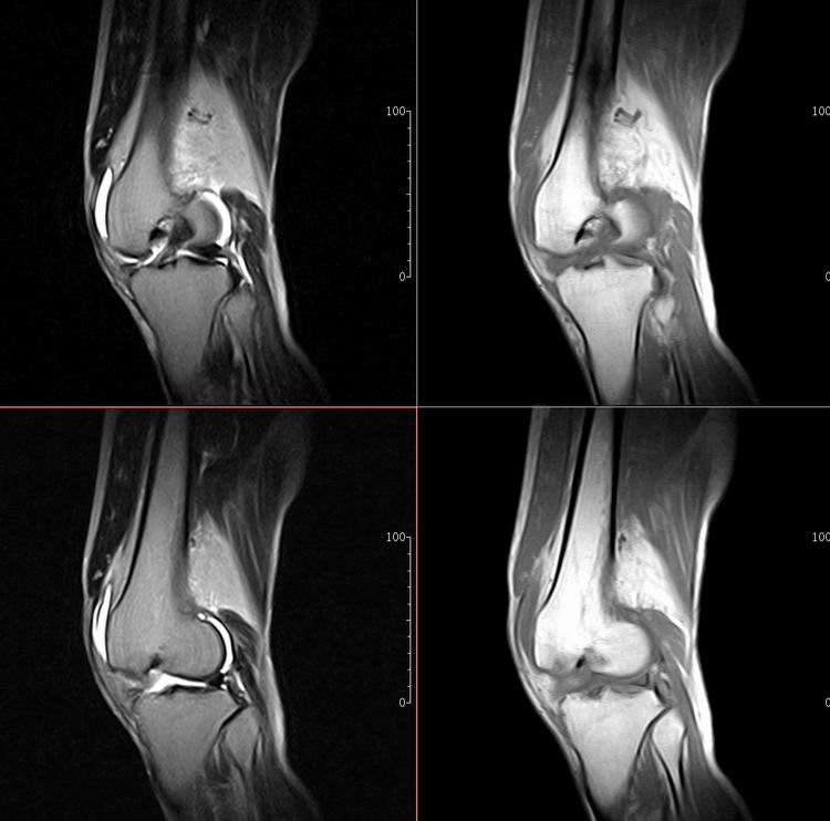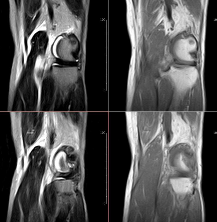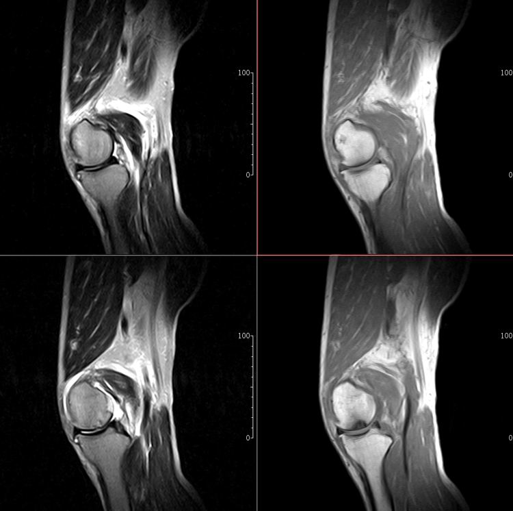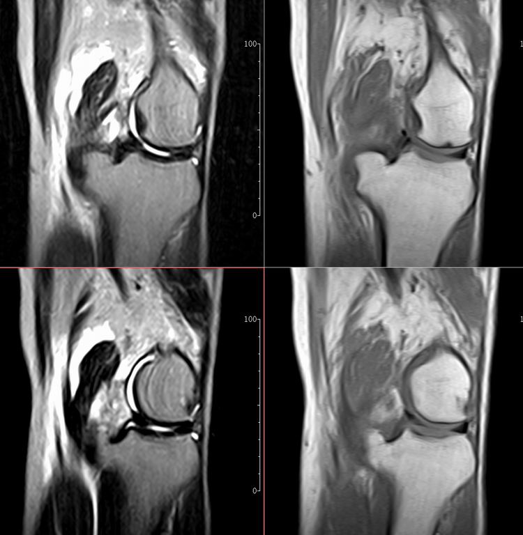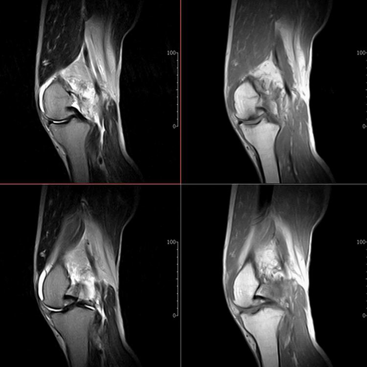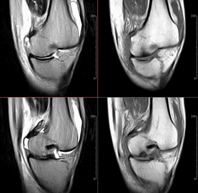 关节退行性变伴股骨外髁关节面下囊肿,不除外剥脱性骨软骨炎.关节积液,髌骨软化症