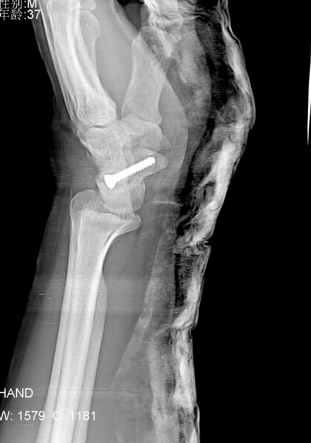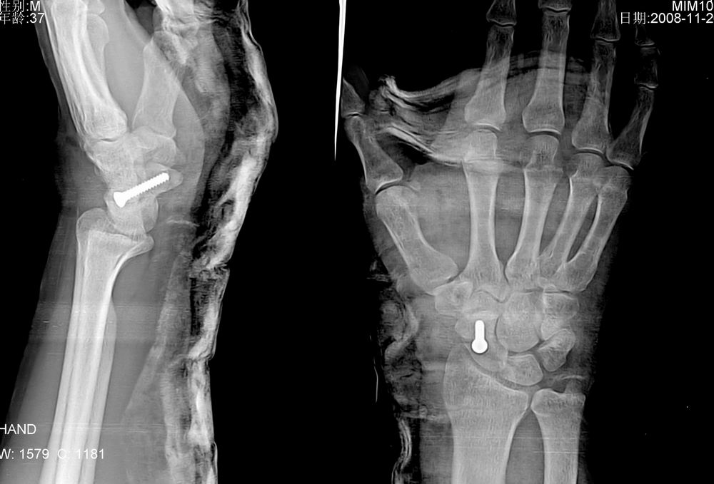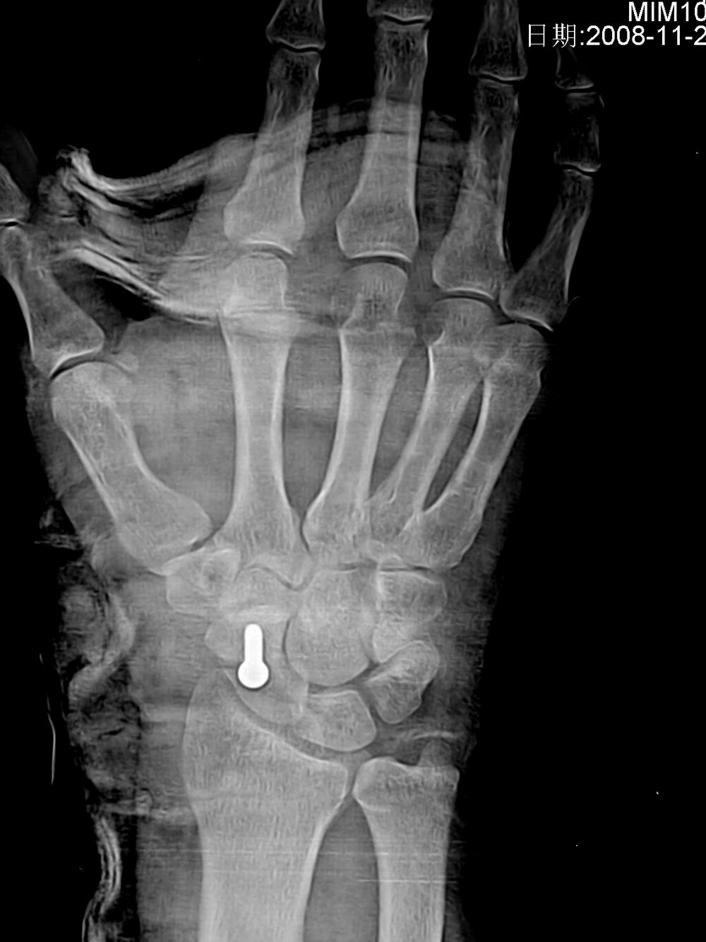 病人来的时候由于韧带砍断了,体位不正,在接韧带时发现舟骨有骨折,做了手术。