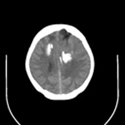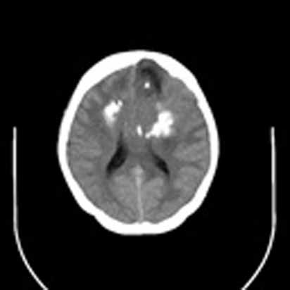 左额混杂密度肿块,经胼胝体跨越中线向右额叶生长,多考虑少支胶质细胞瘤,建议mr增强扫描,待排除血管畸形。