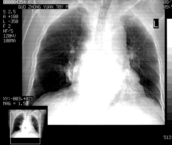 以下是引用zjzjr在2008-12-1 14:53:00的发言:[br]图像不全,请上传,右下肺炎症可能性大,占位待排.心影增大,建议进一步检查.