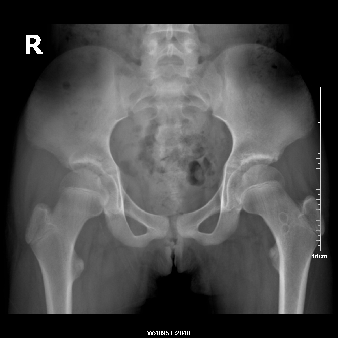 女,10岁,右髋不适3个月。拍片及ct示,股骨颈环状低密度区,边缘硬化,看看是软骨岛或股骨颈疝凹。