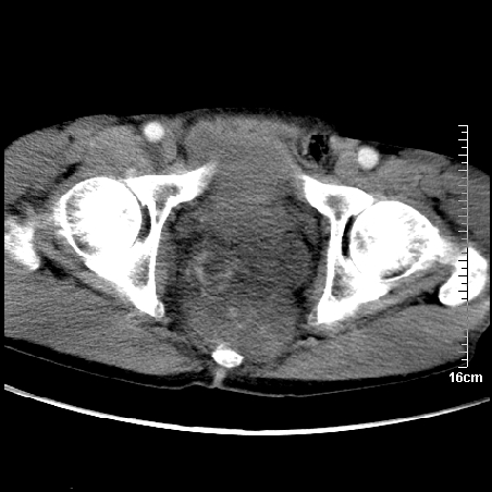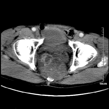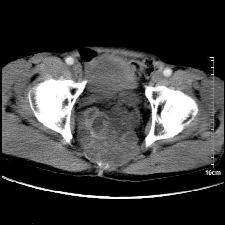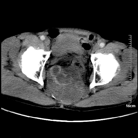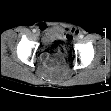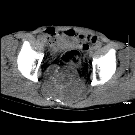 [quote]以下是引用影像孺子牛在2008-12-3 15:34:00的发言:[br]1、骶尾部巨大软组织肿块,部分骶尾骨以被软组织肿块代替,呈不规则侵蚀;病变突向盆腔内;增强扫描病变呈不均质强化;首先考虑脊索瘤。不支持的一点就是病变内无钙化。[br]