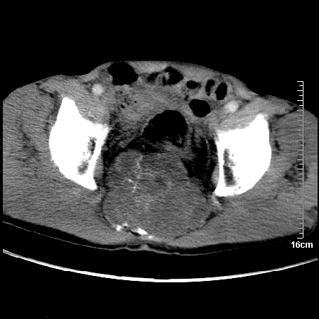 1、骶尾部巨大软组织肿块,部分骶尾骨以被软组织肿块代替,呈不规则侵蚀;病变突向盆腔内;增强扫描病变呈不均质强化;首先考虑脊索瘤。不支持的一点就是病变内无钙化。
