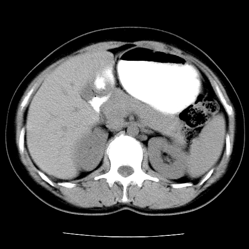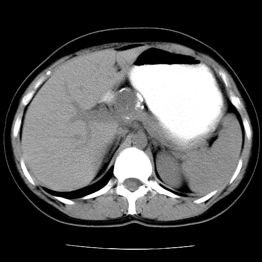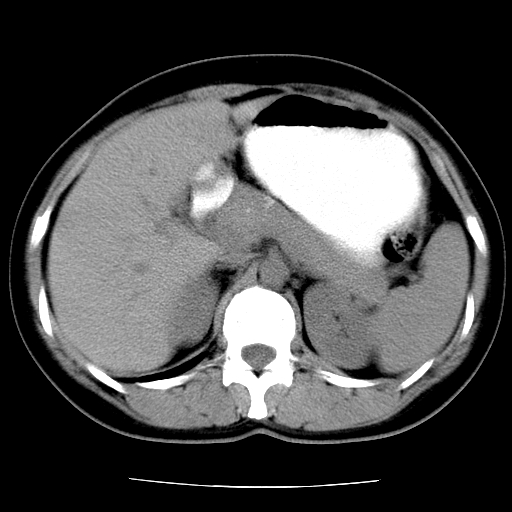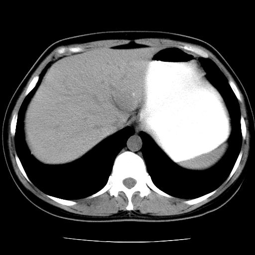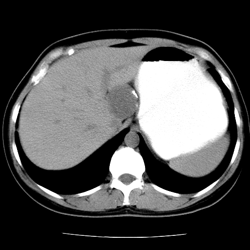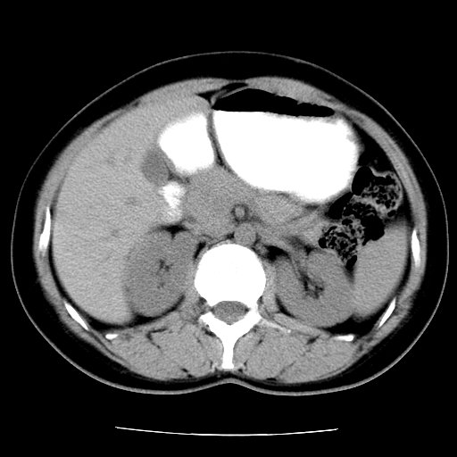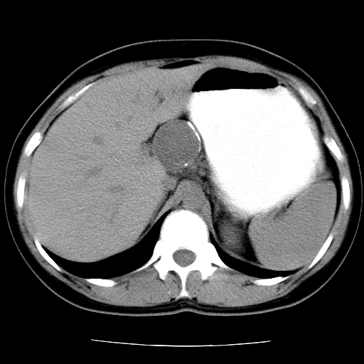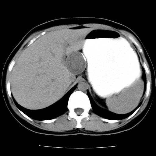 肝胃间隙良性占位病变,考虑囊肿可能性,不除外神经源性肿瘤,建议增强