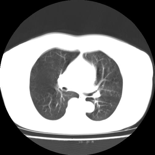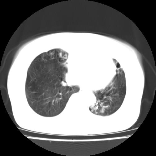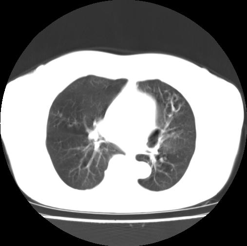 女性病人,56岁,反复咳喘30余年,伴大量脓痰,偶有痰中带血。
