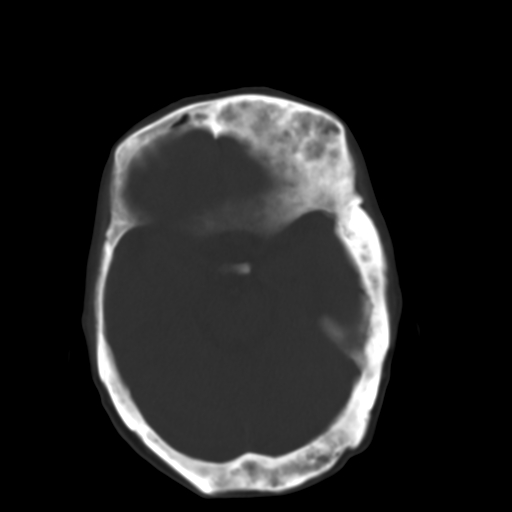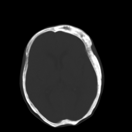 左侧额骨增厚,板障层密度增高。 支持骨纤维异常增殖症 。