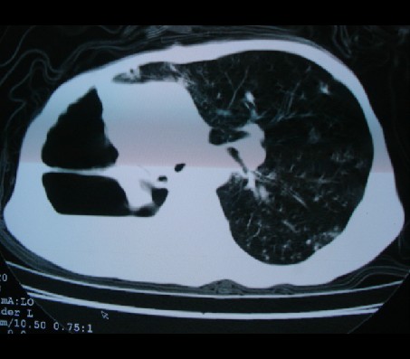 以下是引用随光逐影在2008-12-11 9:24:00的发言:[br]1)两肺继发性肺结核,右肺多发空洞形成并感染,伴左肺支气管播散。2)右侧胸膜增厚、粘连。3)纵隔疝(左→右)。
