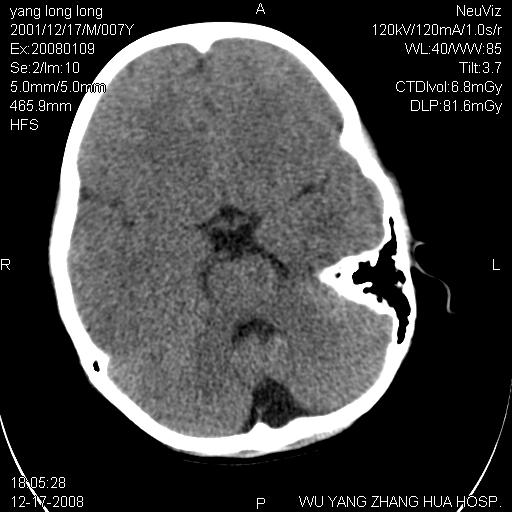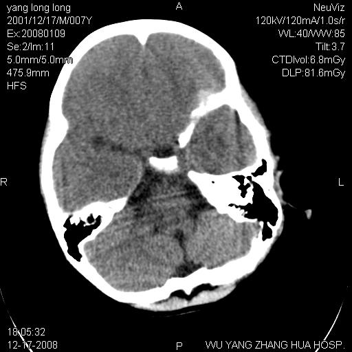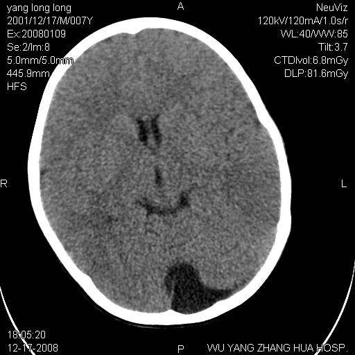 多考虑大枕大池。本例颅骨歪歪的,灶后枕骨似有膨胀征像(为蛛网膜囊肿征像),但整个左侧枕叶后方枕骨均有向后膨隆,所以暂不考虑蛛网膜囊肿。必要时随访