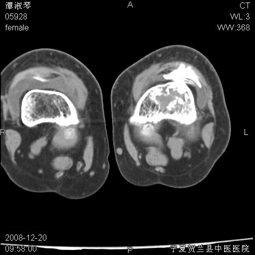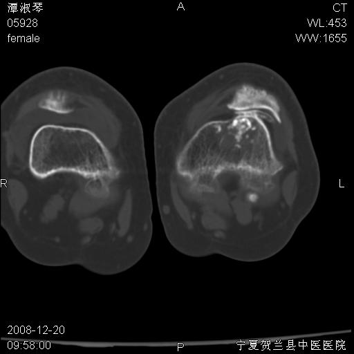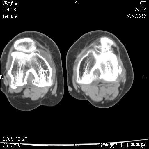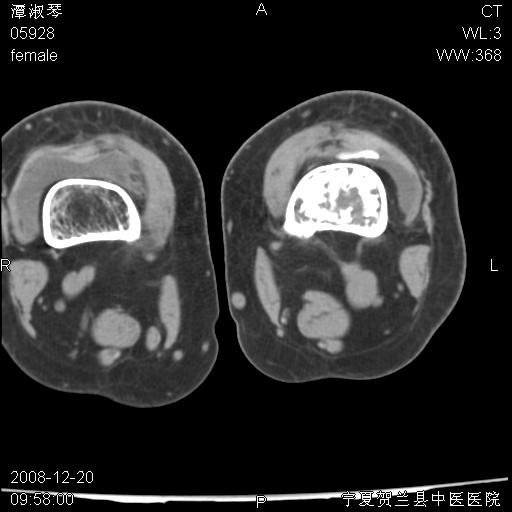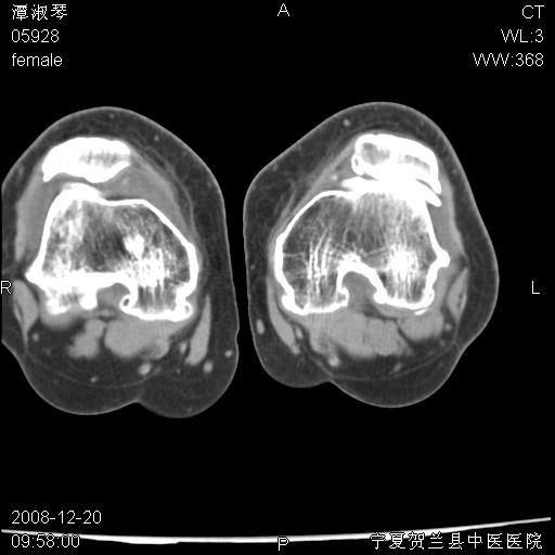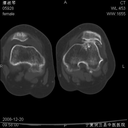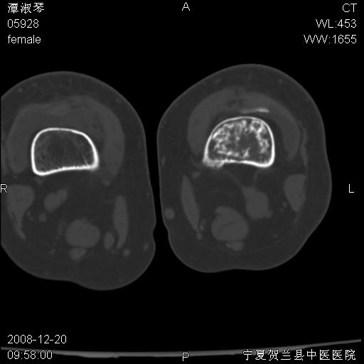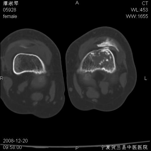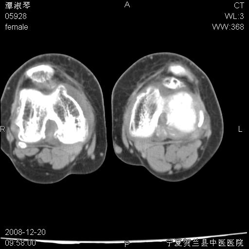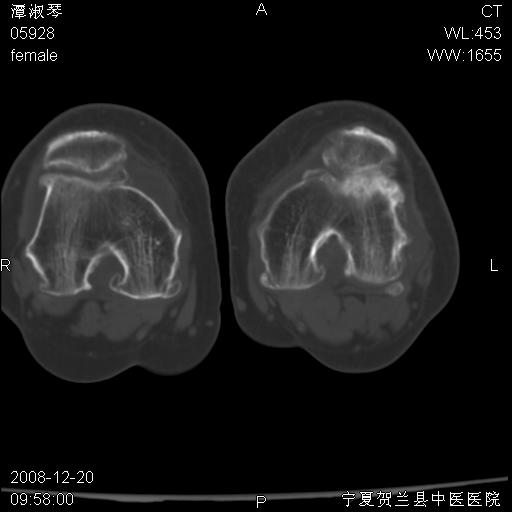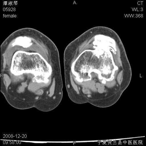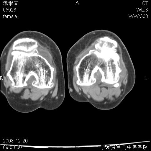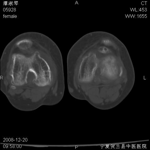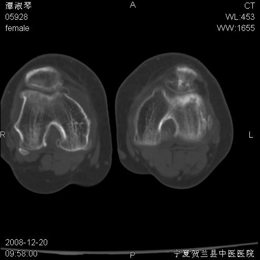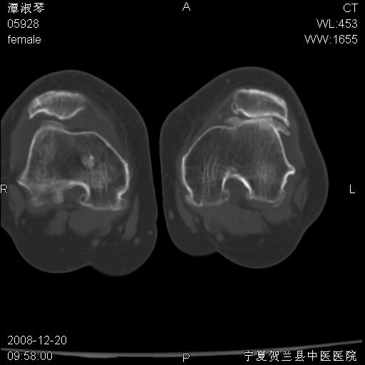 左股骨下段骨梗死。双膝退变。