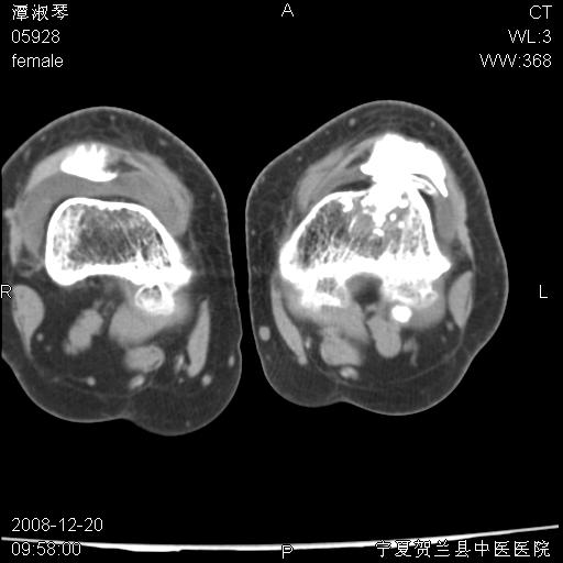 左胫骨下端松质骨及髓腔内可见点片状高密度灶,骨皮质无明显膨胀及变薄。病变范围较长。支持骨梗死,退行性骨关节病,膝关节积液