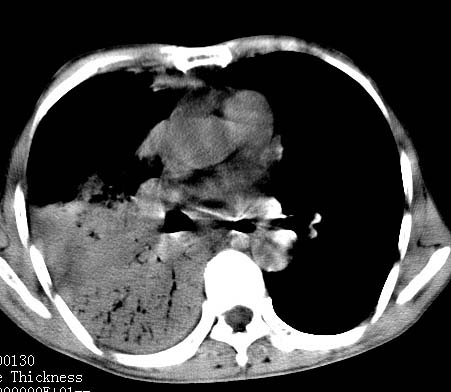 右肺上下叶均见 大片状密度增高影,边界清晰,其内可见支气管充气征,气管支气管通畅。纵膈略向右移位,其内无肿大淋巴结影。首先考虑炎性病变。不排除一些特异性的炎症。不知道发烧吗??wbc高吗??建议治疗后复查!!
