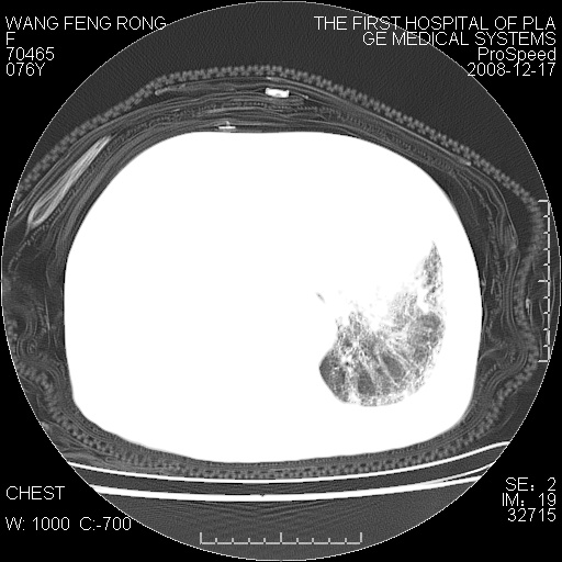 右侧胸腔积液,致右肺膨胀不全,双肺间质纤维化改变