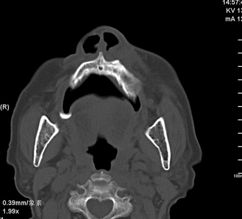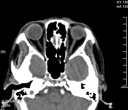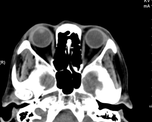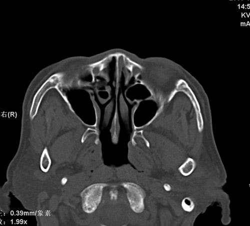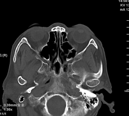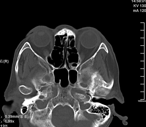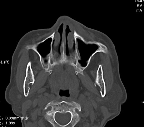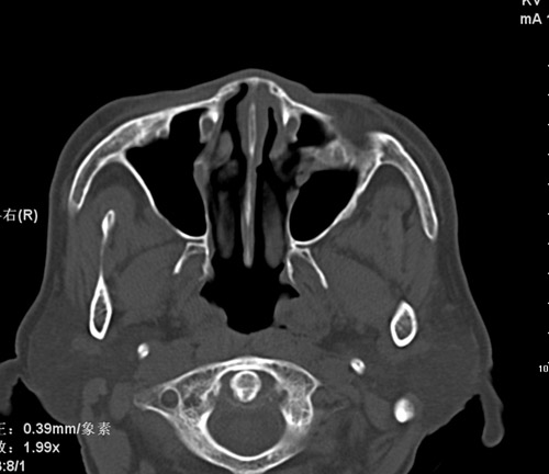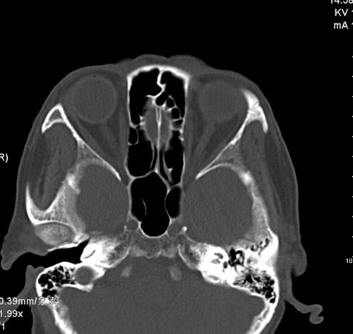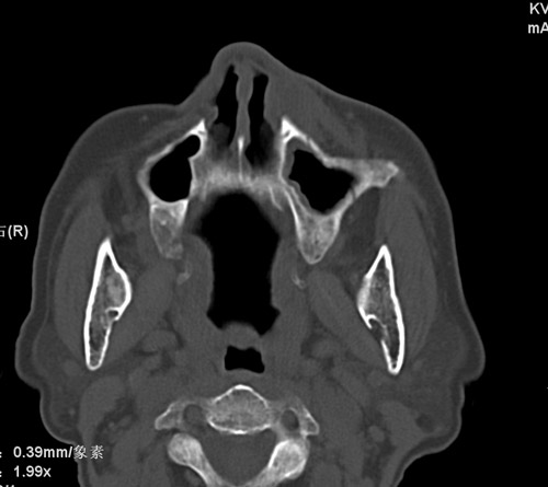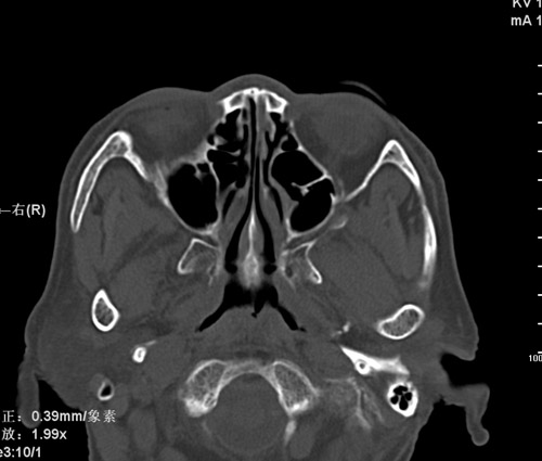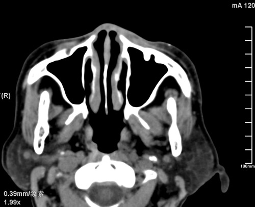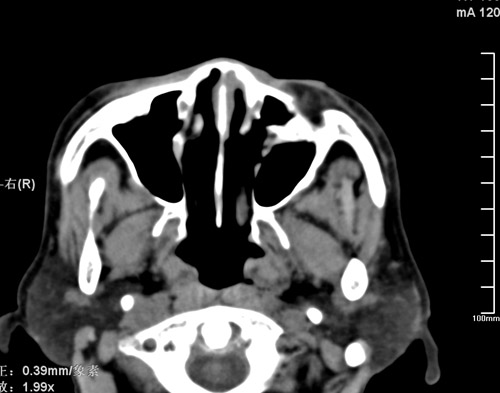 CT17755:女,74 左鼻旁肿胀半年,临床以左上颌窦旁占位行CT