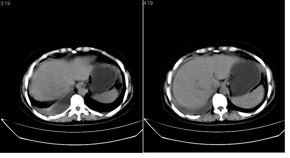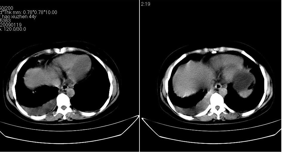 以下是引用zbp537在2009-1-19 14:09:00的发言:[br]从这个平扫图像上看,只能考虑:1、胸腹水。2、脾脏包膜下弧形高密度影,疑出血,建议复查。[br]既然腹水中有恶性细胞,建议行腹部ct增强扫描及胸部扫描。