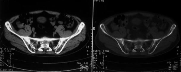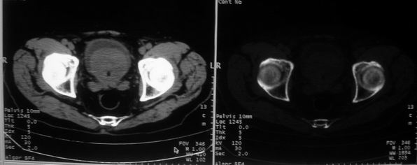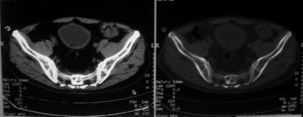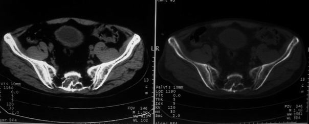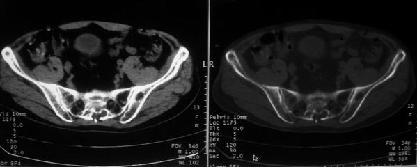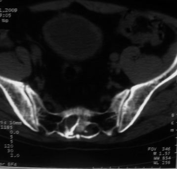 以下是引用随光逐影在2009-1-19 15:38:00的发言:[br]1)考虑前列腺增生症并阻塞性膀胱炎。2)骶椎右侧类似囊状骨质密度减低区,边缘骨质硬化,其内为软组织密度影填塞,相邻之骶椎椎管受压变形;考虑为骶椎右侧囊肿或神经纤维瘤。[br]建议:行mri检查。