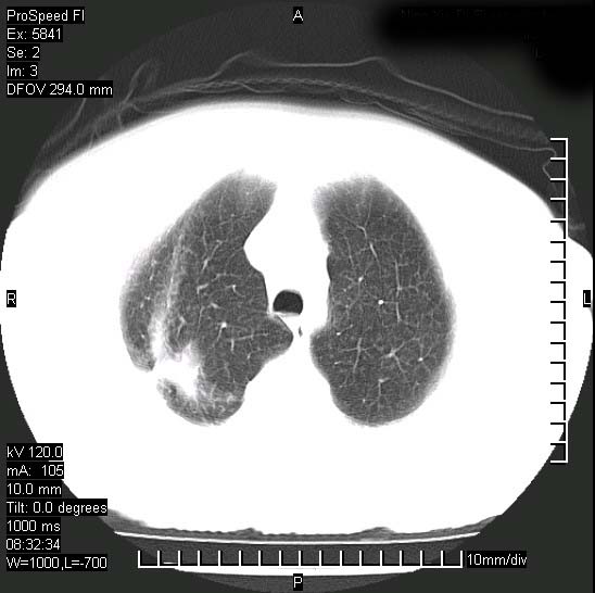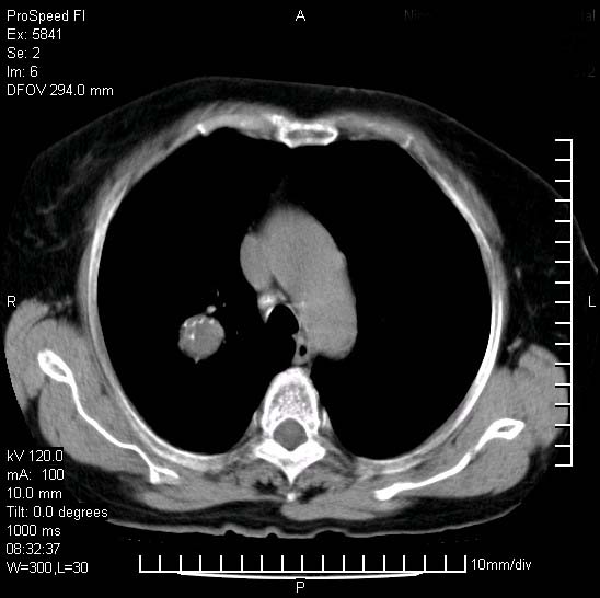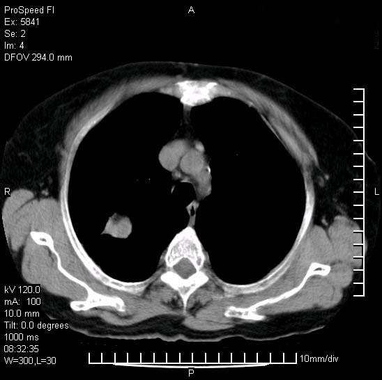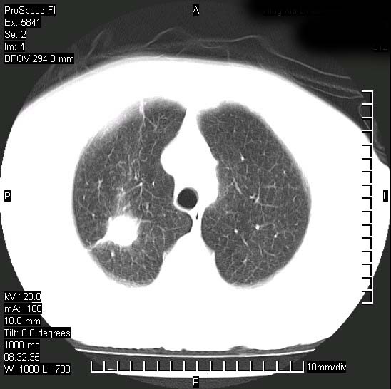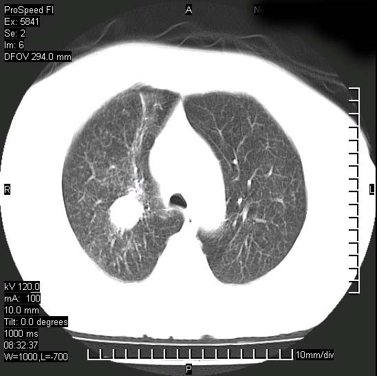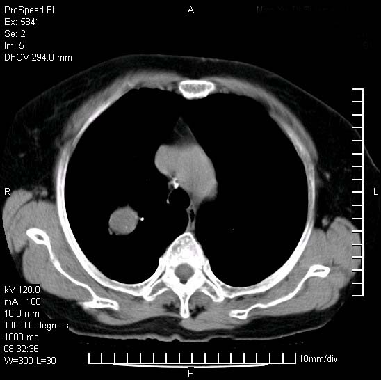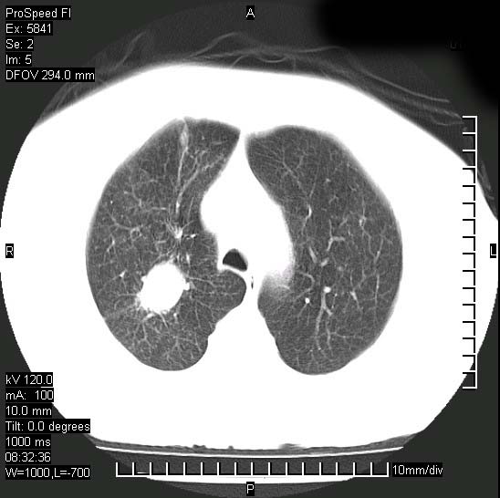 胸痛,咳嗽,气短一周,无发热。右上肺见一结节灶,边缘刺角,内见多个小钙化结节。考虑结核球?肿瘤? 余无异常没有上传。