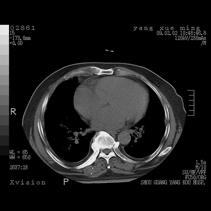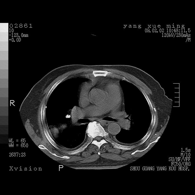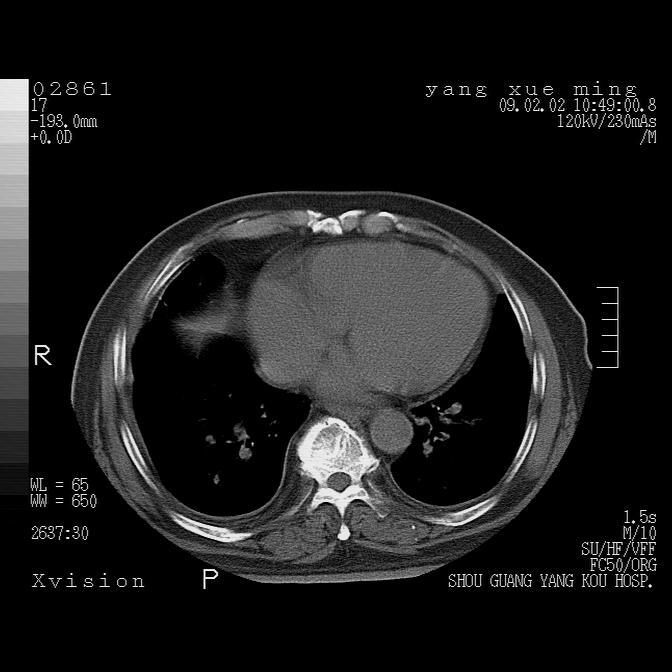 以下是引用lkc8963在2009-2-3 20:11:00的发言:[br]1)右上肺陈旧病灶.2)右下肺团块及团片影,影像表现符合感染.3)左心增大,左冠脉钙化,符合冠心病.4)双侧肺门扩大以左侧为著,肺动脉干略粗,左上肺局限性气肿,为谨慎起见,需除肿瘤,建议增强.