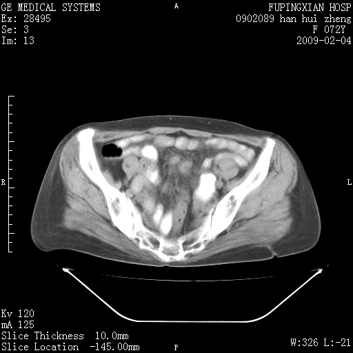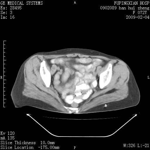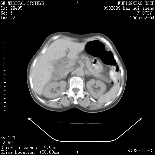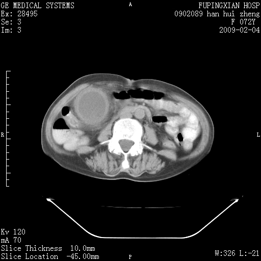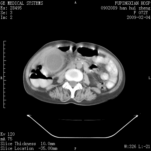 CT17930:F72Y,右腹部包块5日,脐右扪及一包块,触痛。