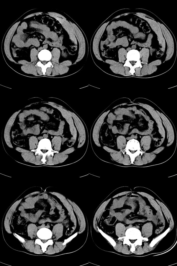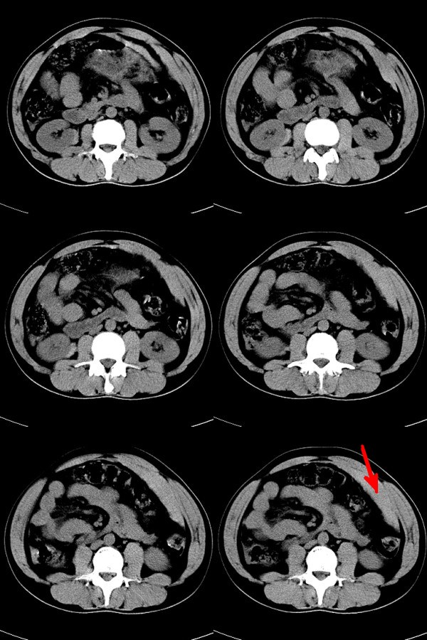 箭头为腹膜外血肿;;建议使用w300---500;l负50--70,可清晰显示腹腔游离气液影,有利空腔器官破裂诊断