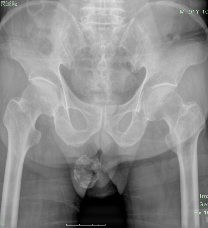 男性,55岁,请大家看看,这个片位于耻骨联合处是什么?
