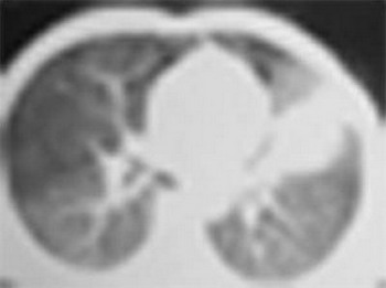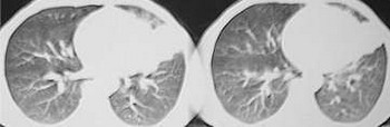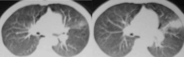 4).实变灶内密度失均,有少量短管状气影,可能为合并之支扩.