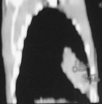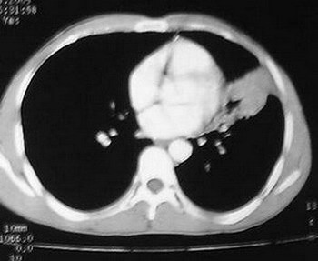 除大家上述征像外,左侧胸廓轻度内陷,纵隔影轻度左移,说明可能有肺不张,因而应首先考虑肿瘤的诊断。